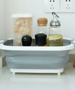 About this itemdown arrowMade from BPA-free flexible plastic and silicon rubber to ensure the health and safety of you and your loved ones.This space-saving kitchen gadget features an ergonomic design that fits comfortably in your hand and an anti-slip surface to keep it steady on your countertop.Say goodbye to messy spills and hello to hassle-free cleanups with its drainage hole that makes it easy to rinse and drain fruits, vegetables, and more.Save time and effort with this 3-in-1 kitchen essential that acts as a cutting board, washing basin, and draining basket all in one.You can fold it down to a compact size of 40 x 31 x 3.5cm, making it easy to store in your kitchen cabinet or take with you on the go.Make meal prep a breeze with its extended size of 40 x 31 x 13.5cm, offering ample space to prepare and wash your food.