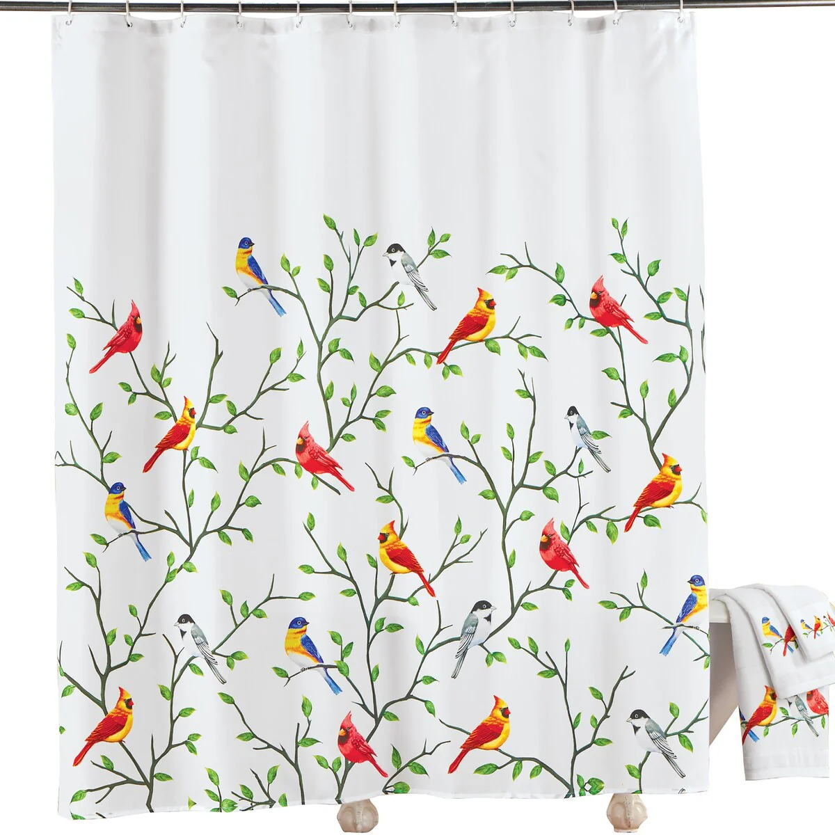 Beautiful songbirds including cardinals, bluebirds and chickadees sitting atop gracefully arching branches make this shower curtain a lovely addition to your home. Includes 12 curtain hooks for easy hanging. Machine wash. Polyester; imported. Plastic hooks are 2 1/4"L x 1 1/2"W. Curtain is 70"L x 70"W.