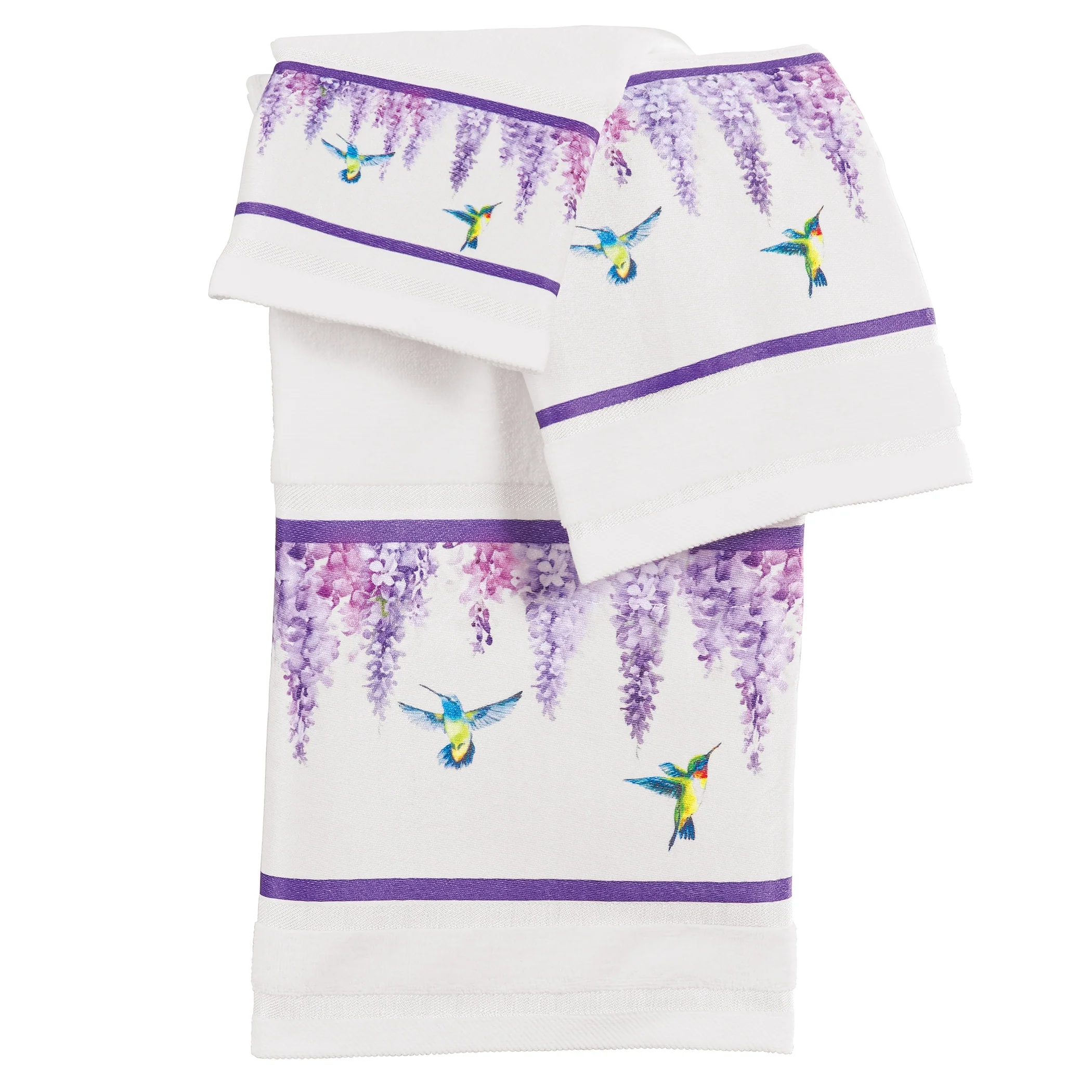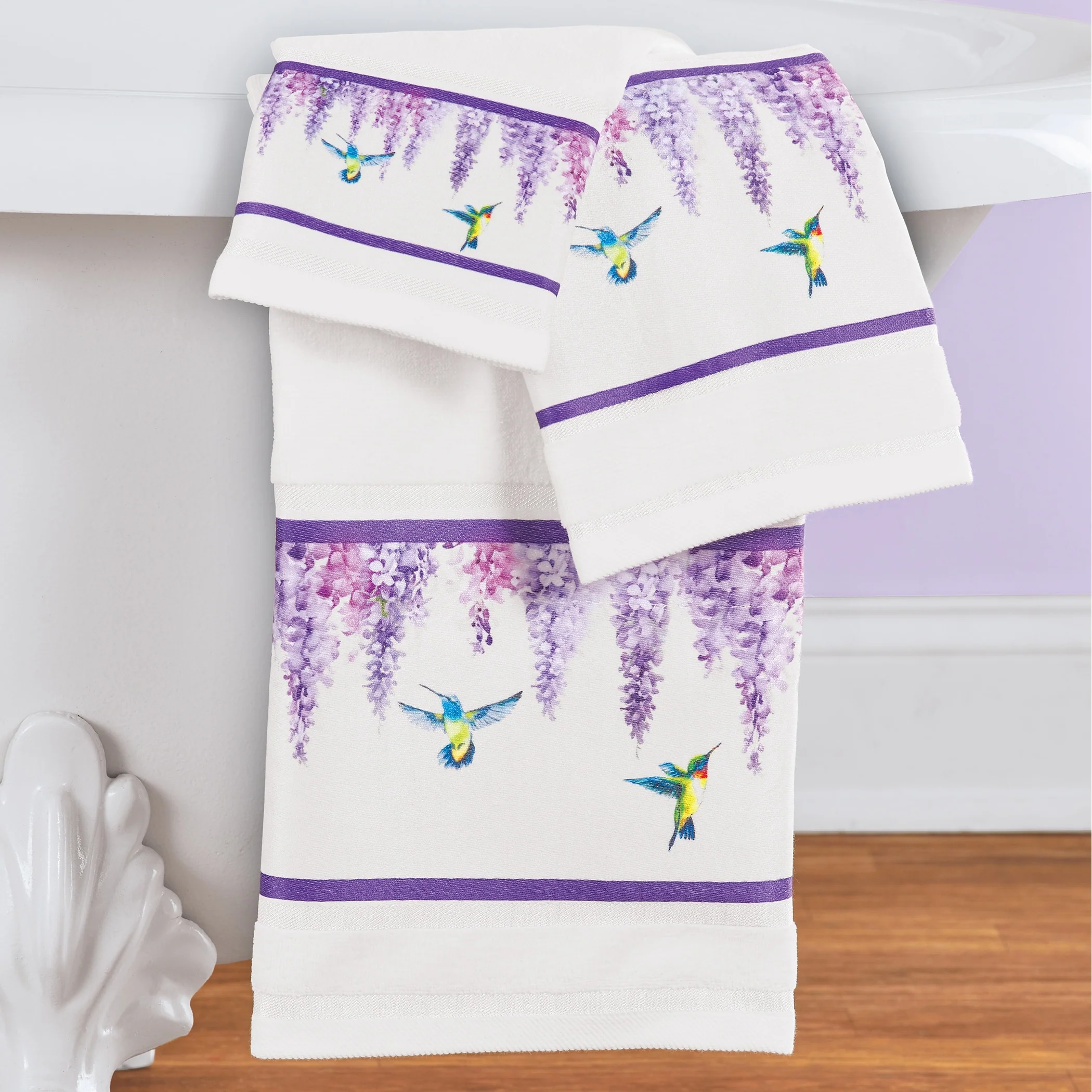 This 3-piece towel set features gorgeous purple wisteria flowers with colorful hummingbirds fluttering below. The printed image is bordered in purple stripes atop a white background. The delightful set includes a 48"L x 24"W bath towel, 25"L x 16"W hand towel, and a 12"Sq. washcloth. Machine wash. Cotton and polyester; imported. 3-Piece Set.