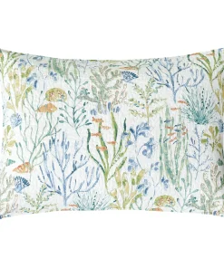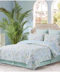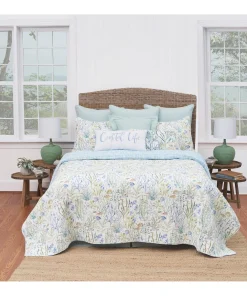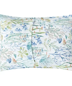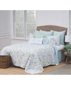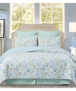 Make any bedroom a beach house with Coralie Sounds abstract coastal watercolor design. The painterly pattern of coral, tropical fish, and shells bring sweet dreams of seaside vacations. Reverse to a blue and white crosshatch pattern reminiscent of sunshine playing along the waves. Crafted of cotton this quilt set is machine washable for easy care.