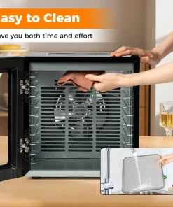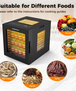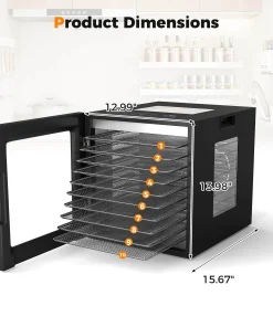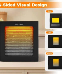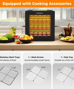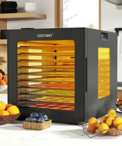 Boasting 360° airflow circulation technology, this food dryer ensures even drying for your favorite snacks. The 4-sided viewing windows and bright LED lights provide a clear view of your creations as they dry. The intuitive control panel offers 10 preset programs, along with customizable temperature and timer settings to cater to your specific needs. Not to mention, the sturdy metal hinges, convenient handles, and integrated thermostat with overheat protection ensure safe and smooth operation. Complete with 10 stainless steel trays, a mesh screen, and a drip tray that also acts as a fruit roll sheet, this food dehydrator simplifies your cooking process.