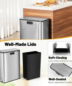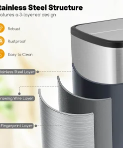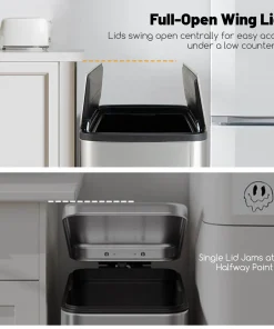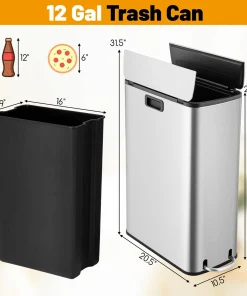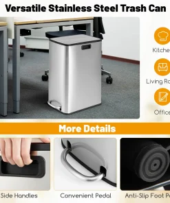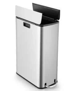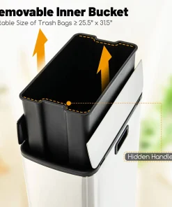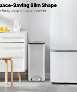 What makes the narrow trash can stands out is its clever wing lid, which pops open smoothly, making it ideal for tight spots. With convenient step-on foot pedal, you can toss garbage into the waste bin with ease. Plus, the gentle soft-closing mechanism ensures the lid shuts quietly without catching your fingers. And the removable inner bucket allows you to swap out bags easily. Crafted from 3-layer stainless steel, the trash bin is easy-to-clean and rust-resistant for longevity. Furthermore, the slim body makes the trash bin seamlessly adapt to narrow spaces. And the cut-out handle enables you to move it wherever you want effortlessly.