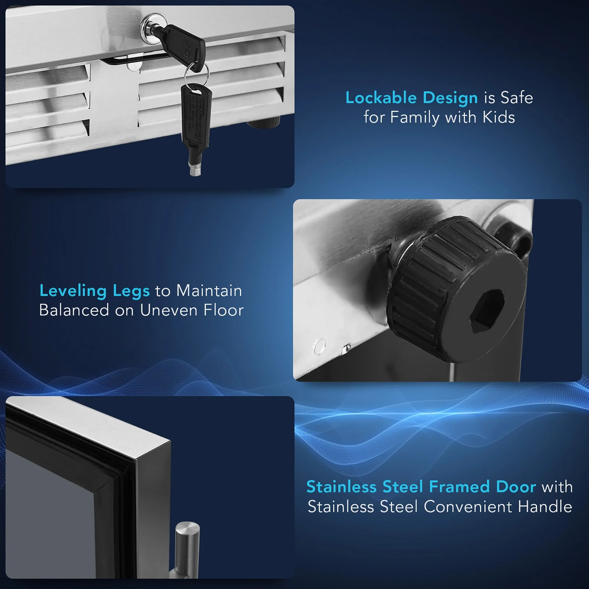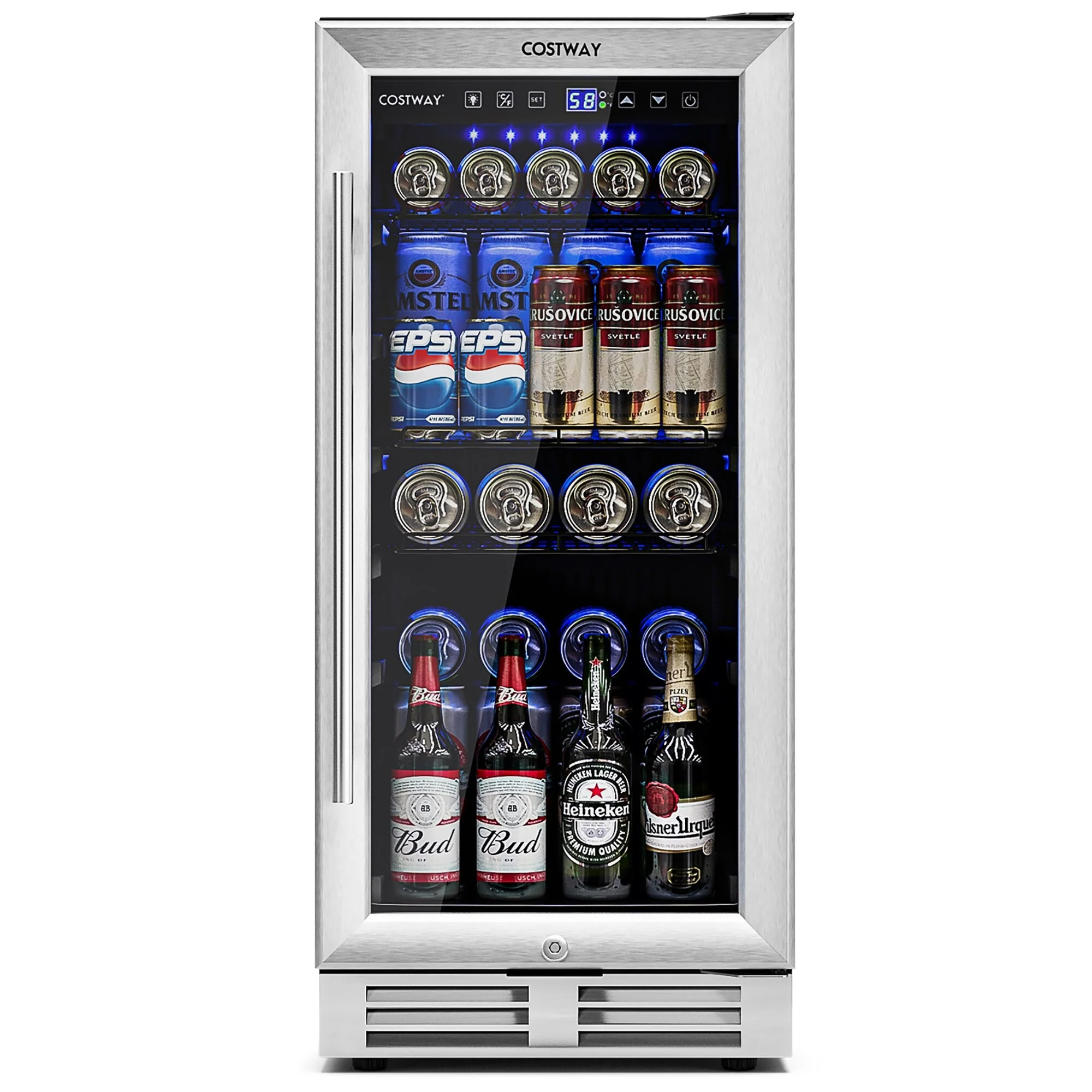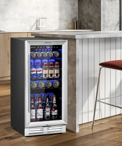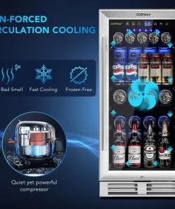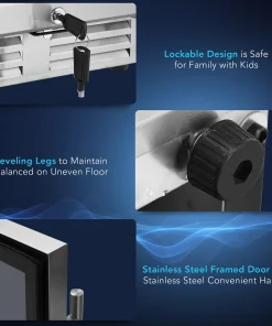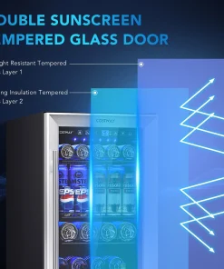 Our beverage fridge has 3 adjustable steel wire shelves and shelf stoppers to prevent cans from slipping with the ability to store 100 cans of standard-size beverage. The advanced compressor with a fan-forced circulation system and auto-defrost function rapidly and soundlessly cools down the cabinet while the double tempered glass door prevents cool air from escaping. The door can be locked and it is easy to spot your drinks without opening them up. Perfectly fitting into the standard kitchen counter, this beverage cooler is a space-saving solution with a sleek outlook and built-in blue LED lights to maintain visibility and add atmosphere. In addition to that, it is easy to operate the cooler with an intuitive control panel and LCD display.