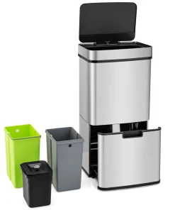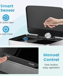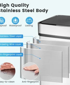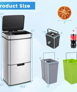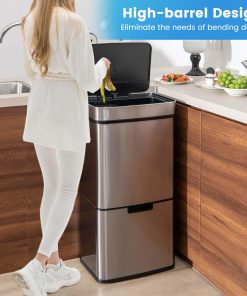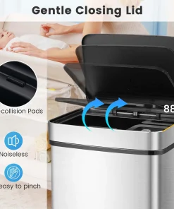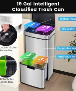 The 19 gallon trash bin will open in just 0.3 seconds when it senses vertical movement, making it completely hands-free. The garbage can comes with a 12 gallon main compartment and a removable 1 gallon bin to separate kitchen waste and dry waste. Additionally, the 2 removable 3 gallon cans are designed in different colors for classification. With staying open design, you can dispose trash without having to physically touch the lid. And the soft-closing lid is quiet and not easy to pinch. Crafted with 3-layer stainless steel, the trash can is stain-resistant and waterproof for longer lifespan. Plus, the anti-slip foot pads will protect your floor from being scratched.