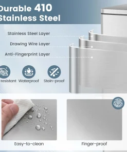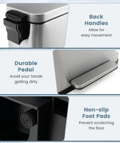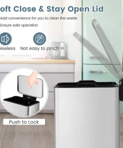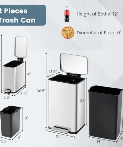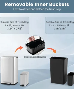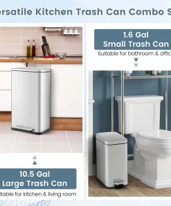 The versatile step-on trash can combo set comes with a 1.6 gal small trash can and a 10.5 gal large trash can, catering to your varying needs in kitchen, office or bathroom. With convenient handles, you can effortlessly relocate the kitchen waste bin set of 2. Constructed with rust-resistant, finger-proof and waterproof stainless steel, these garbage bins provide a pristine look through years of use. When continuous access is required, the stay-open functionality allows for easy discarding without the hassle of manually holding the lid. Moreover, the gentle close lid is noiseless, which is not easy to pinch your hands. And you can embrace the convenience of a hands-free approach with step-on pedals. Additionally, the removable inner buckets simplifies the cleaning process.