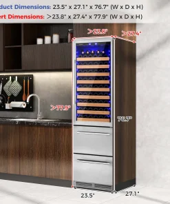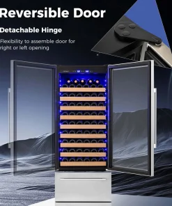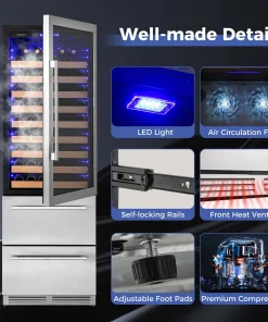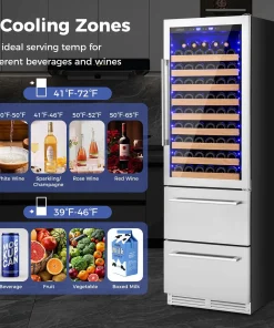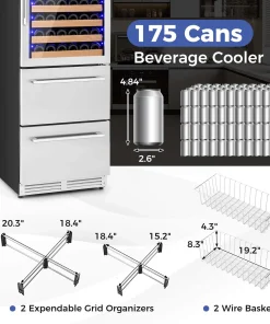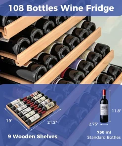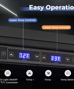 This bar fridge is ingeniously designed for both built-in and freestanding setups for great convenience. Moreover, this beverage cooler features separate temperature controls for wines (41℉-72℉) and beverages (39℉-46℉), ensuring each drink is perfectly chilled. Its substantial storage capacity accommodates up to 108 bottles and 175 cans, smartly organized across beech wood shelves, expendable grid organizers and wire baskets. With its innovative 360° 3D air duct system and a triple-layer glass door, it ensures a frost-free environment and excellent insulation, all while operating quietly at ≤37dB. Additionally, the intuitive LED display and internal blue lighting not only enhance functionality but also add a touch of elegance, making it a stellar addition to any space.