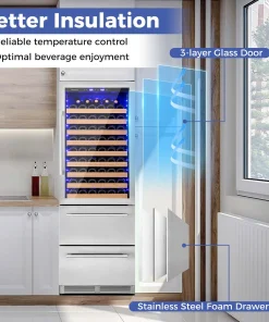 The 3-layer glass door and stainless steel foam drawers provide superior insulation