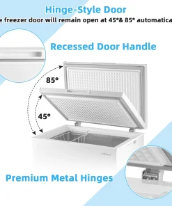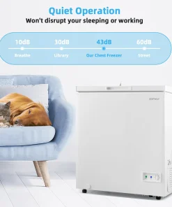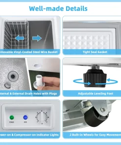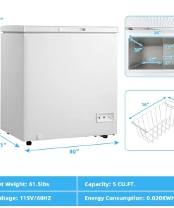 Equipped with a high efficiency compressor, D-shaped condensing tube and excellent thermal insulating technology, this freezer with a large capacity of 5 cubic feet can achieve rapid cooling to keep a variety of food or drinks cold and fresh. And you can adjust the temperature by turning the control knob to 7 levels from -11°F to 10°F. The removable wire basket allows you to store some small foods for easy access. The internal &external drain holes with plugs are designed for easy drainage and manual defrosting. The hinged door on the top provides easy access to the freezer’s contents. Additionally, 2 adjustable foot pads increase overall stability and 2 built-in wheels make it easy to move anywhere. Our compact, quiet and energy-saving freezer takes up small space, which is perfect for any areas, such as the kitchen, living room, dormitory, office and more.