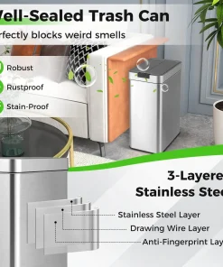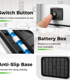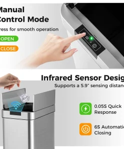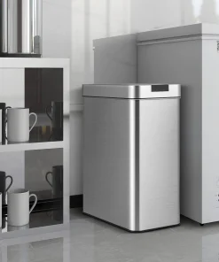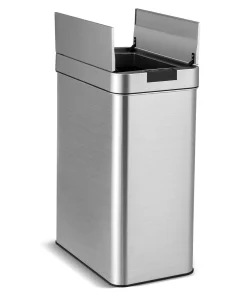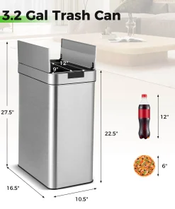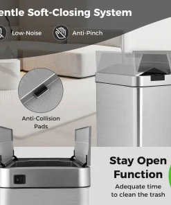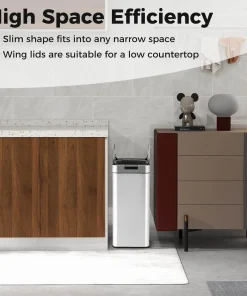 Effortlessly open the automatic waste bin with an infrared motion sensor by simply waving your hand. This device offers a 0.05s quick response and 6s automatic closing, ensuring a touch-free experience. Made of robust and stain-proof stainless steel, this trash can promises great longevity, while offering a 13.2 gal capacity. The soft-closing wing lids ensure low-noise and anti-pinch features. As needed, the lids can remain open at an angle of 87°. The slim shape and wing lids allow for easy placement in compact areas or under a low countertop. This motion sensor trash bin is effortless to use and needs 4 x C batteries (not included), upgrading your waste disposal experience with its sleek and convenient design.