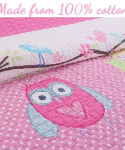 Rather you want to refresh a child’s room or a guest room you will be pleased. Brighten up your sleeping space with this cute pink, purple, white, blue and green whimsical floral, polka dot, birds and owls cotton quilt set. Pattern so fun it reminds you of childhood memories playing in the outdoors. Fun pattered florals and polka dot fabrics in various colors all patchworked together beautifully in this quilt. Cute little birds sing on floral tree branches, while several owls are perched add that perfect finishing touch. This quilt set is crafted of 100% Cotton. This quilt will give your sleeping space a cool, spontaneous, fun look. Quilt is reversible so that you can quickly and easily change the look of your room. Set offered in Twin and Queen (with or without decor throw pillows). Coordinating accessories also available for purchase separately are the various Décor Throw Pillows. With its easy-care machine-washable cotton material, this quilt set is easy and quick to launder. Spot clean decor throw pillows.