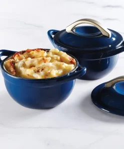 Beautify dinner with the Chrissy Teigen 2 Piece 4.7 Inch Enameled Cast Iron Mini Casserole Set. Each mini baking dish holds a personal meal that is visually enhanced with the gold accented handle. The enameled cast iron body is oven safe for crispy dishes to serve to guest. Make the perfect mac and cheese, bake personal desserts, cook scalloped potatoes or anything your heart desires! Â