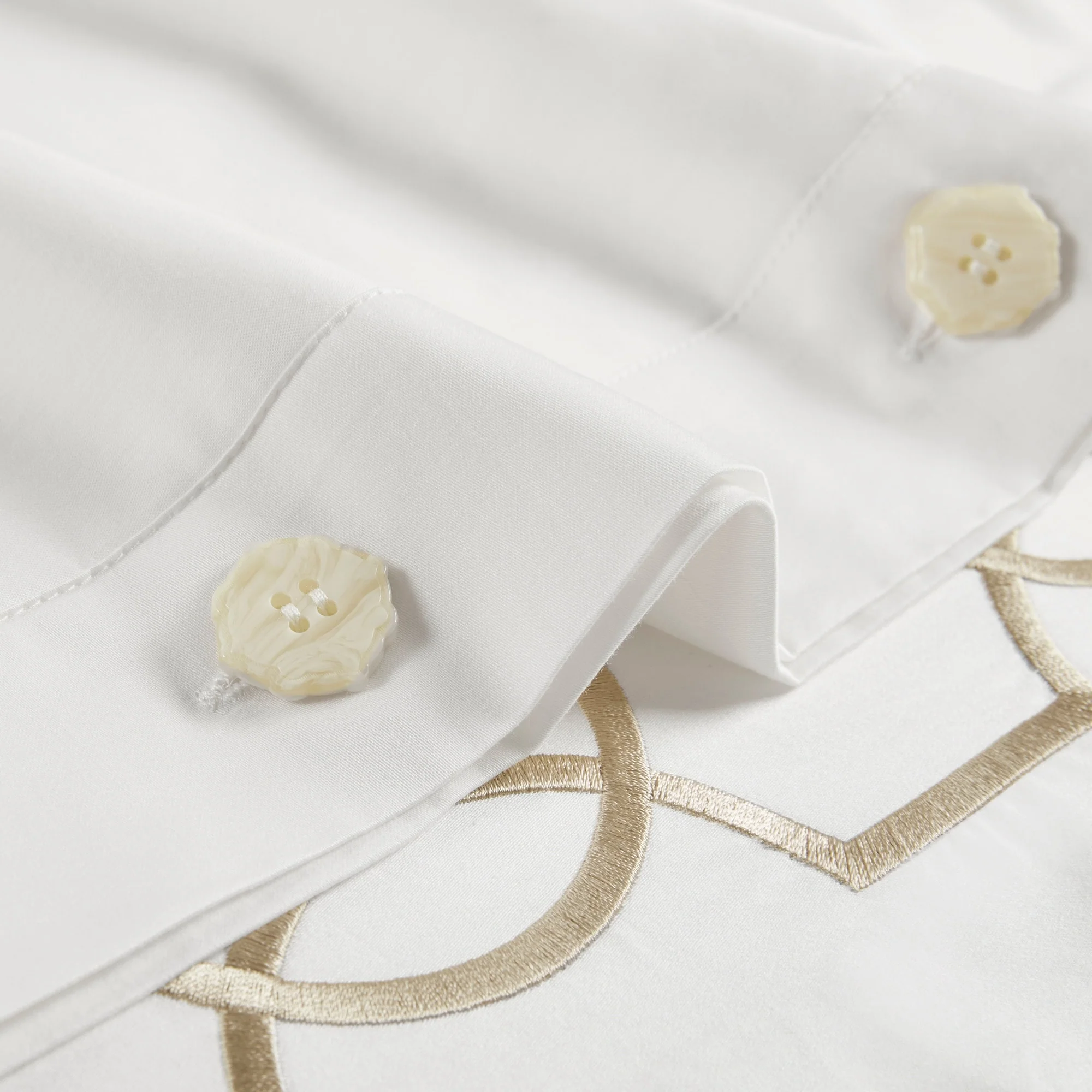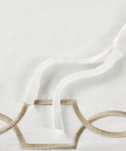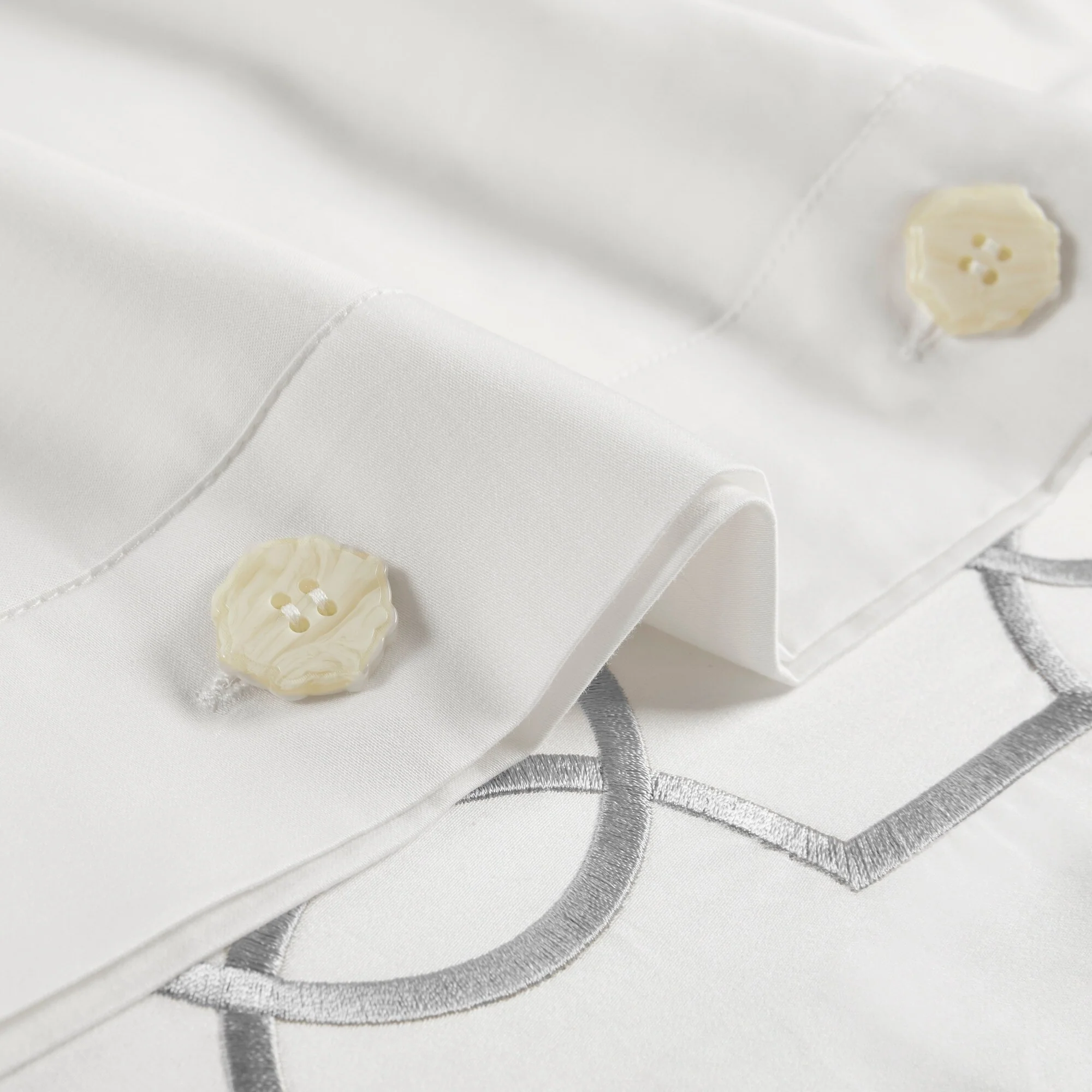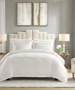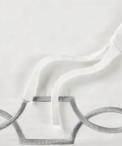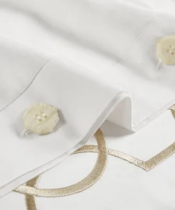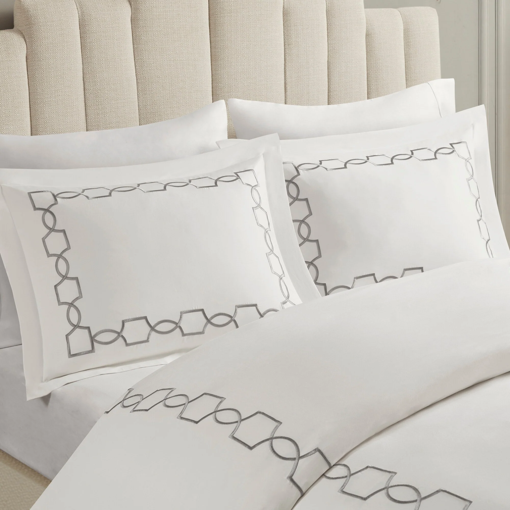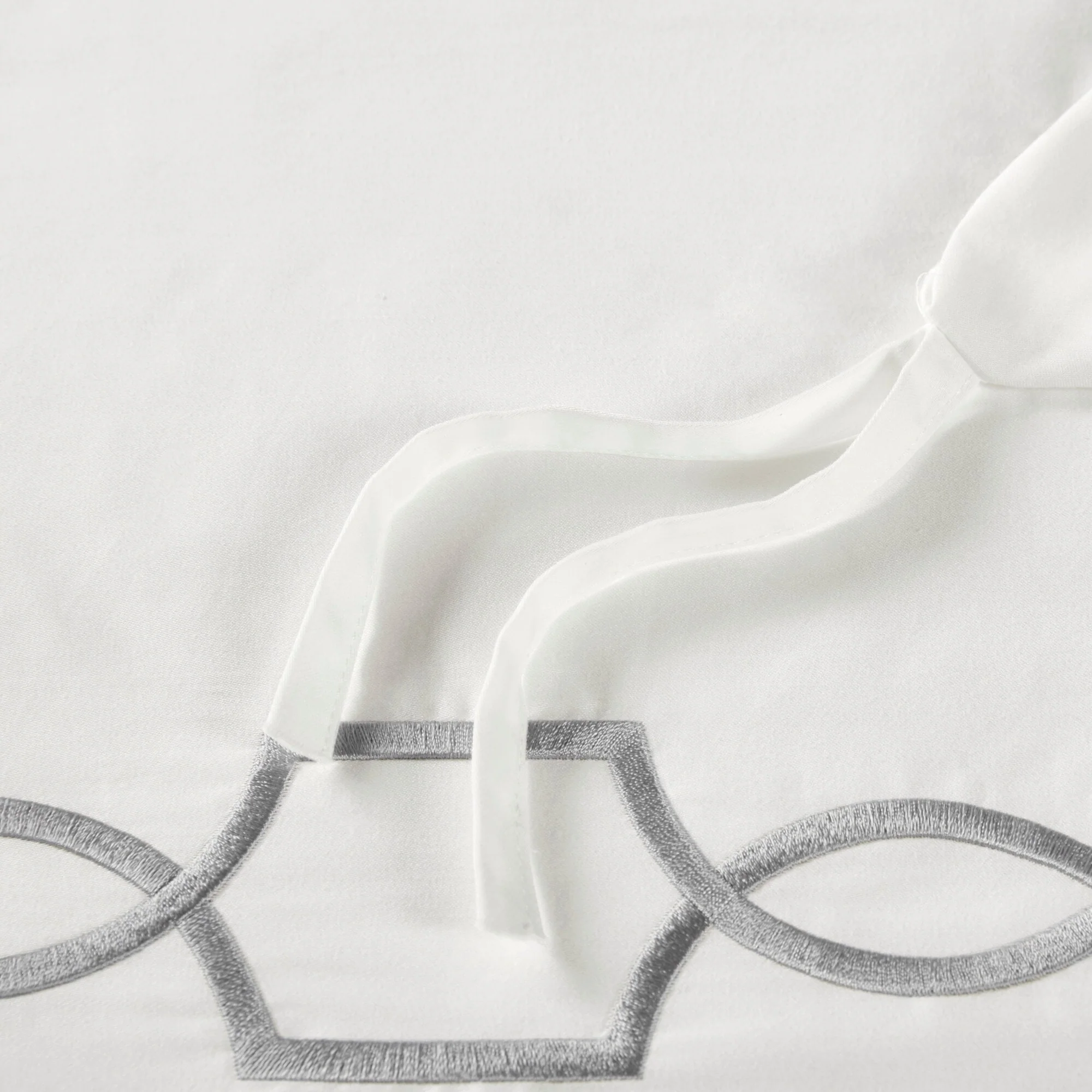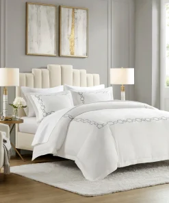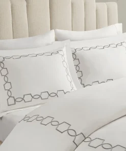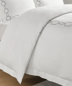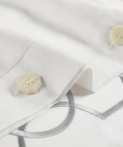 The base fabric is a blend of cotton and rayon from bamboo, which is incredibly soft to the touch and comforting. The embroidered frame pattern features a high-density embroidery stitch that embellishes the bedding, while at the same time keeping the design simple, relatable, and perfect for everyday use.