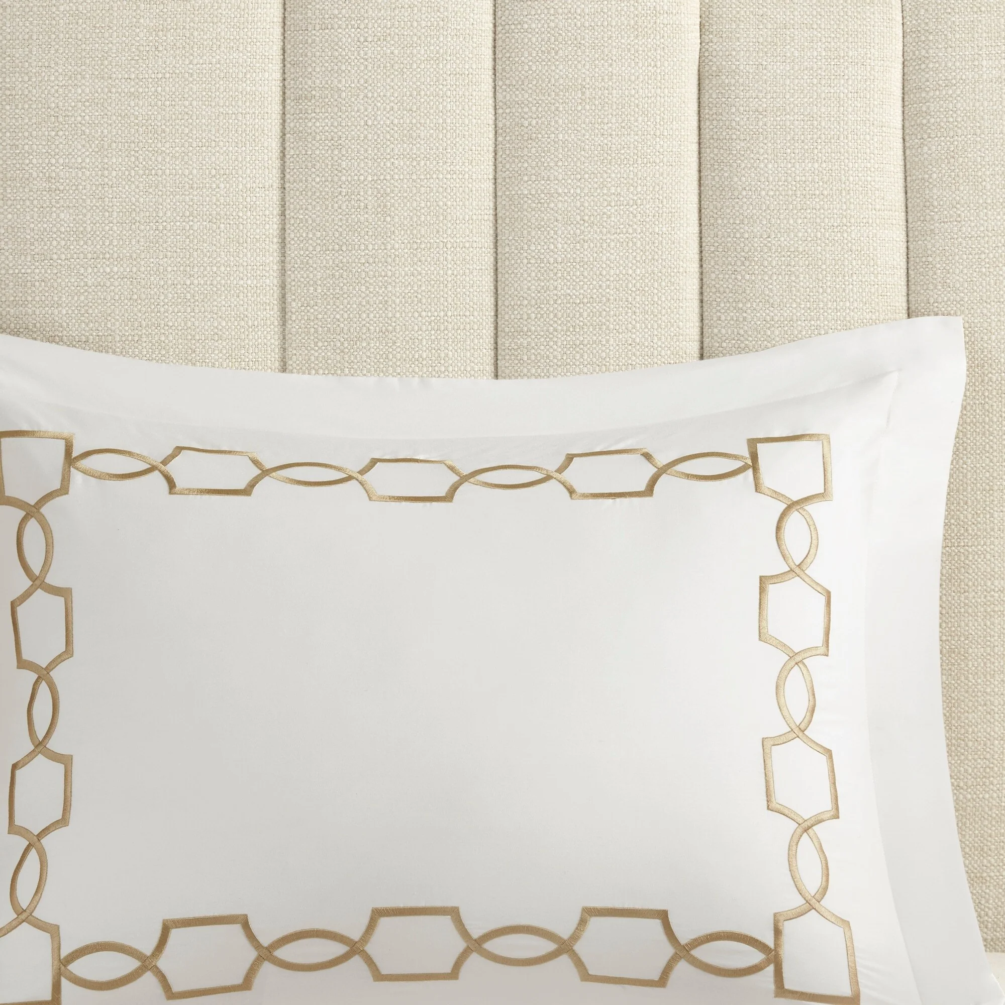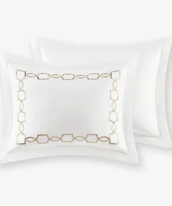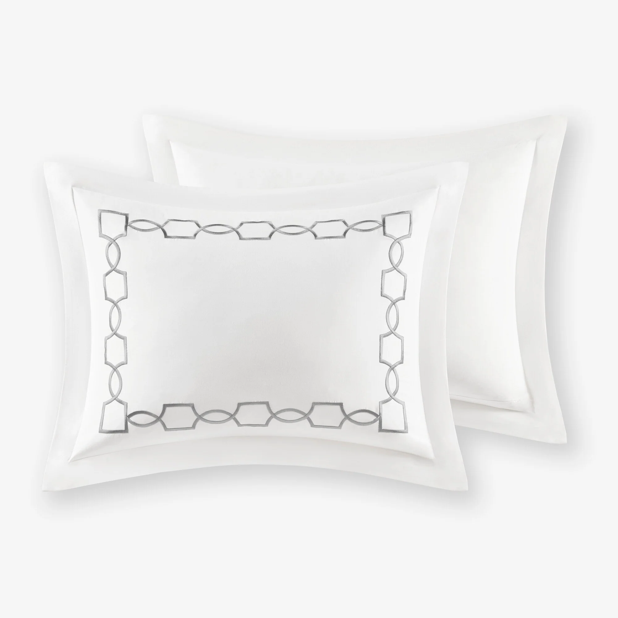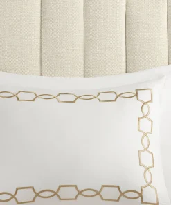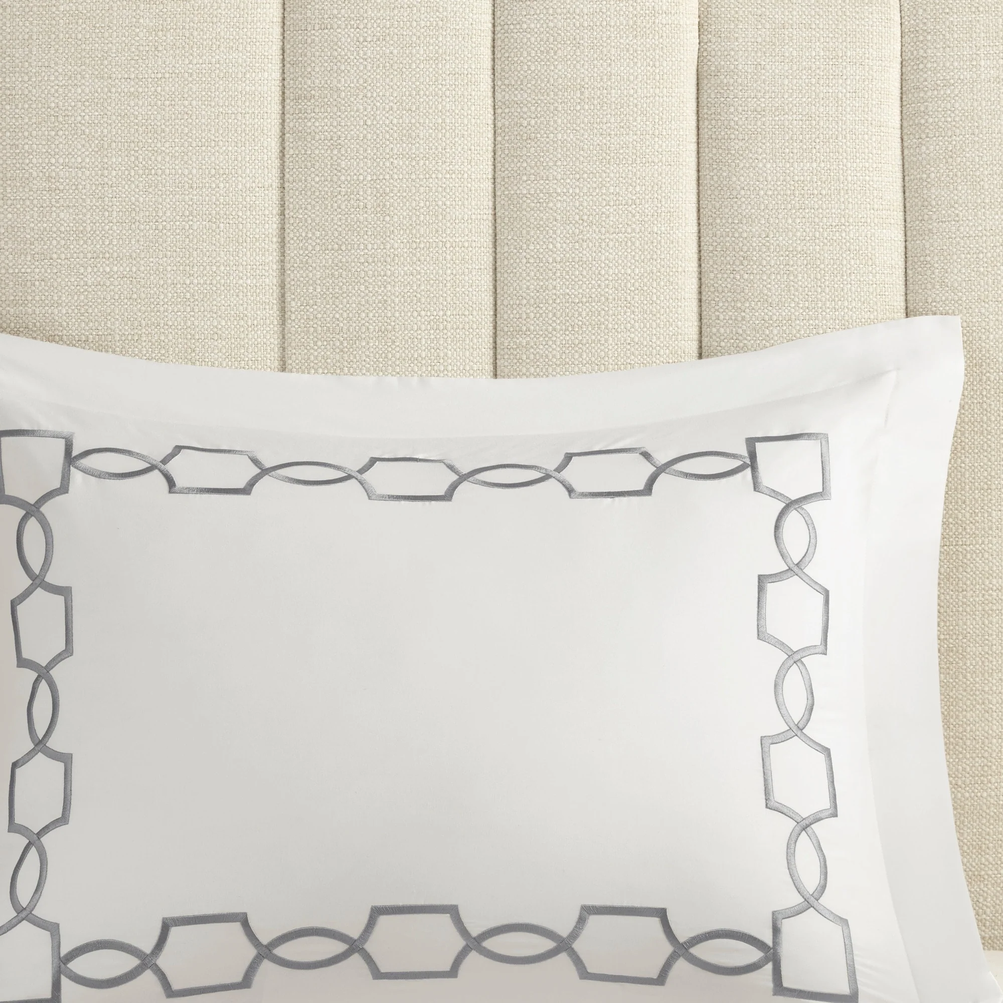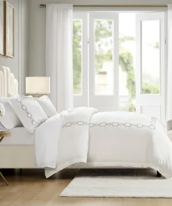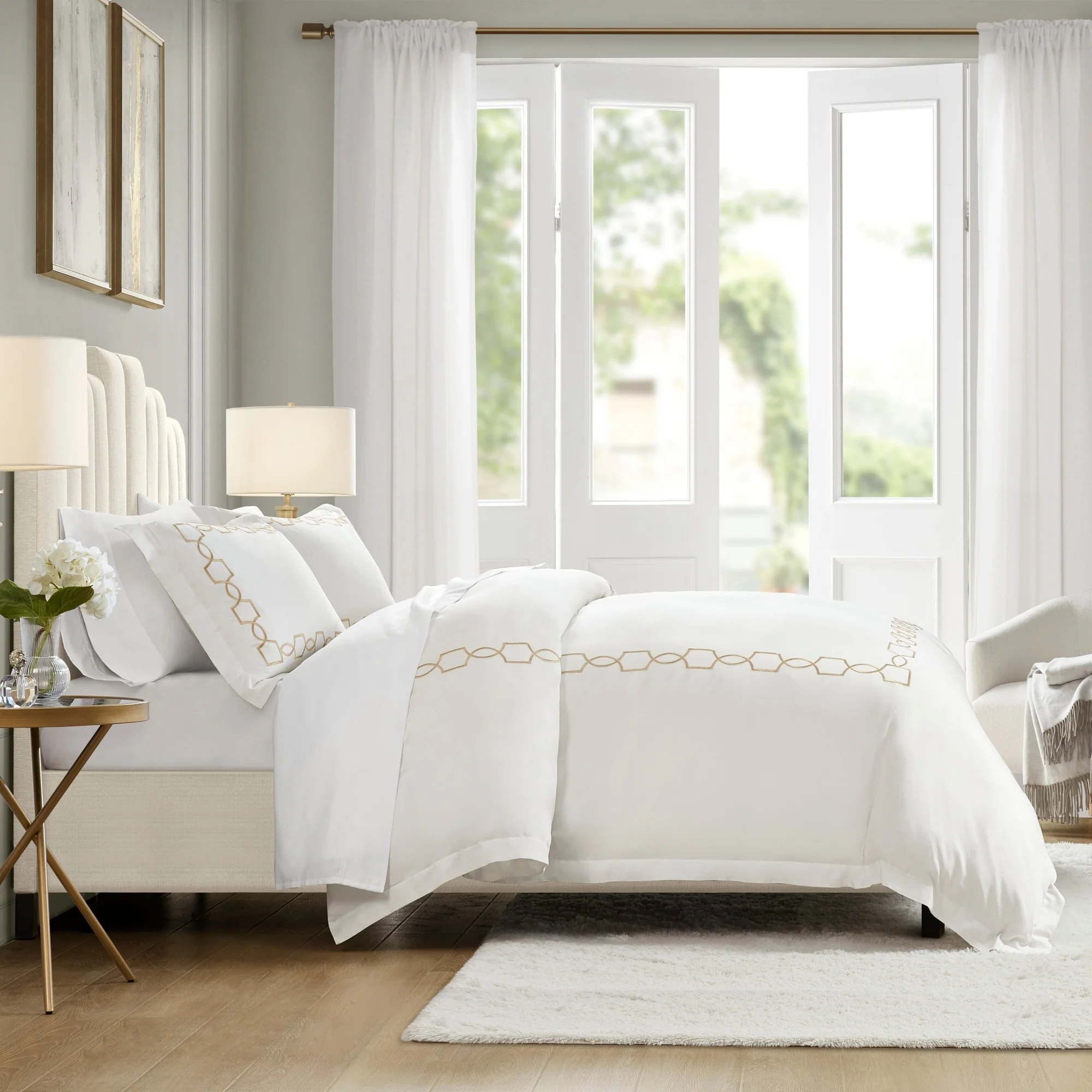The base fabric is a blend of cotton and rayon from bamboo, which is incredibly soft to the touch and comforting. The embroidered frame pattern features a high-density embroidery stitch that embellishes the bedding, while at the same time keeping the design simple, relatable, and perfect for everyday use.