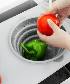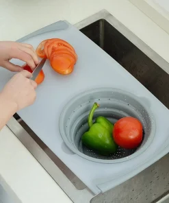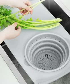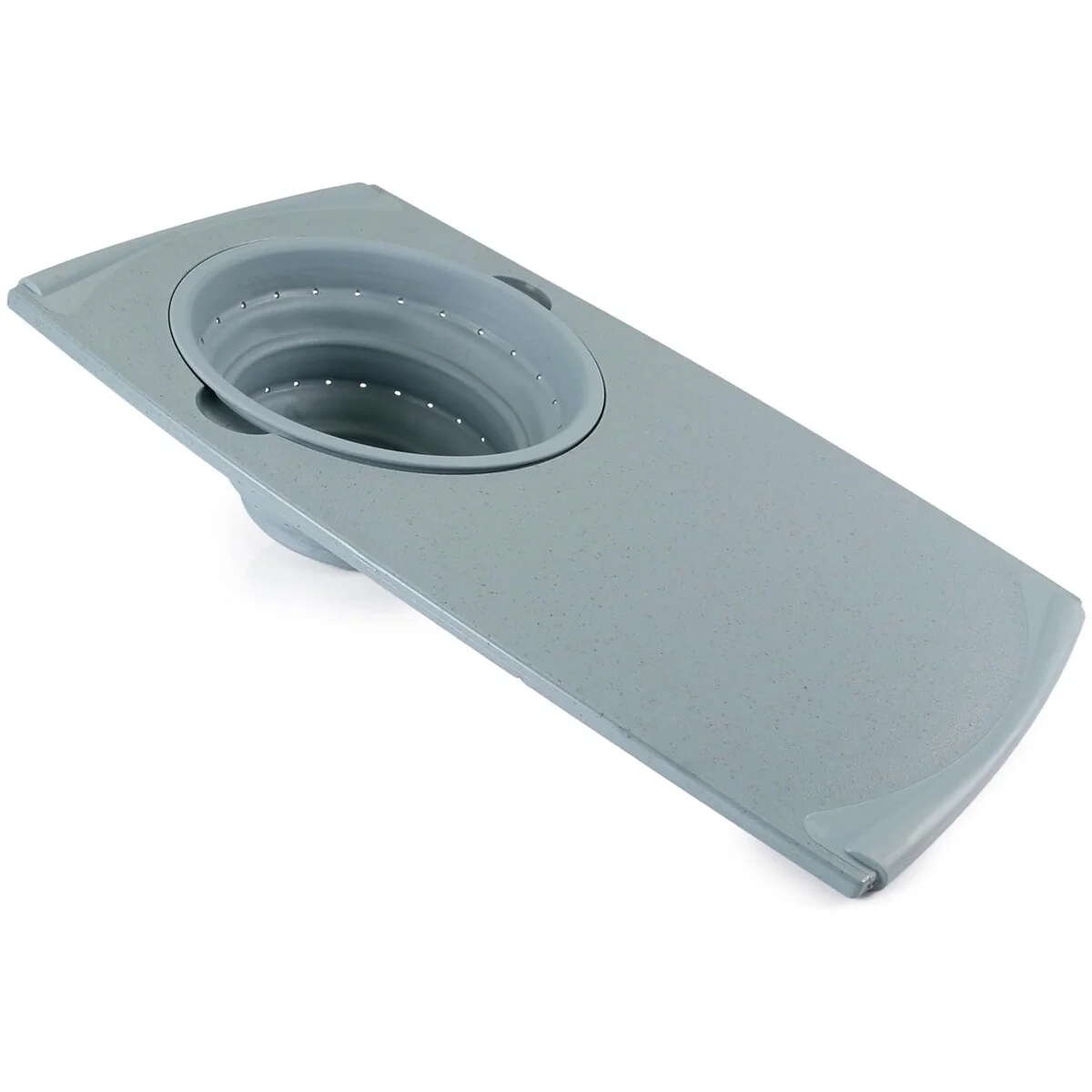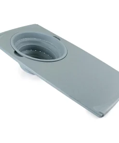 GRAY FINISH: Featuring a gray finish, this collapsible cutting board strainer perfectly blends with all kinds of kitchen supplies. Sleek rectangle design to effortlessly fit over most sinks.