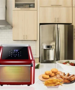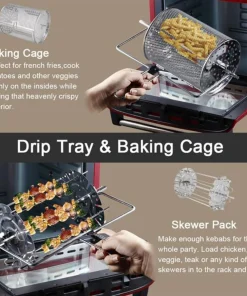 All-in-One Air Fryer, Oven, Rotisserie, and Dehydrator With the Large Air Fryer you are on your way to healthy eating without sacrificing on taste or flavor. Cook, fry, grill and bake without the need for butter, oil or other unhealthy fats. With Rotisserie Chicken Fork, it could cook 3kgs( 6pounds ) Chicken with crisp outside and juice inside. Each Deluxe Air Fryer Oven comes with a fry pan (drip tray), three fry net, chicken fork , rotating basket , skewer rack , fetch rack. Double layer window with inside glass and outside transperant PC. Power Lighting inside, give you a good vision and cool touch.