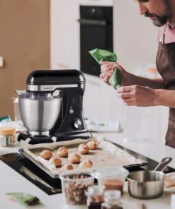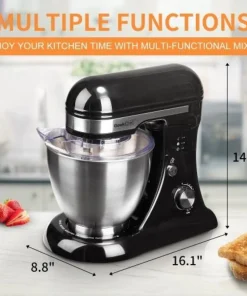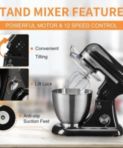 The powerful motor has a 12-speed design with a knob on the base for easy adjustment. A tilt-neck design (with lock/release button) makes it easy to swap out attachments on the baking dough stand mixer as you please.