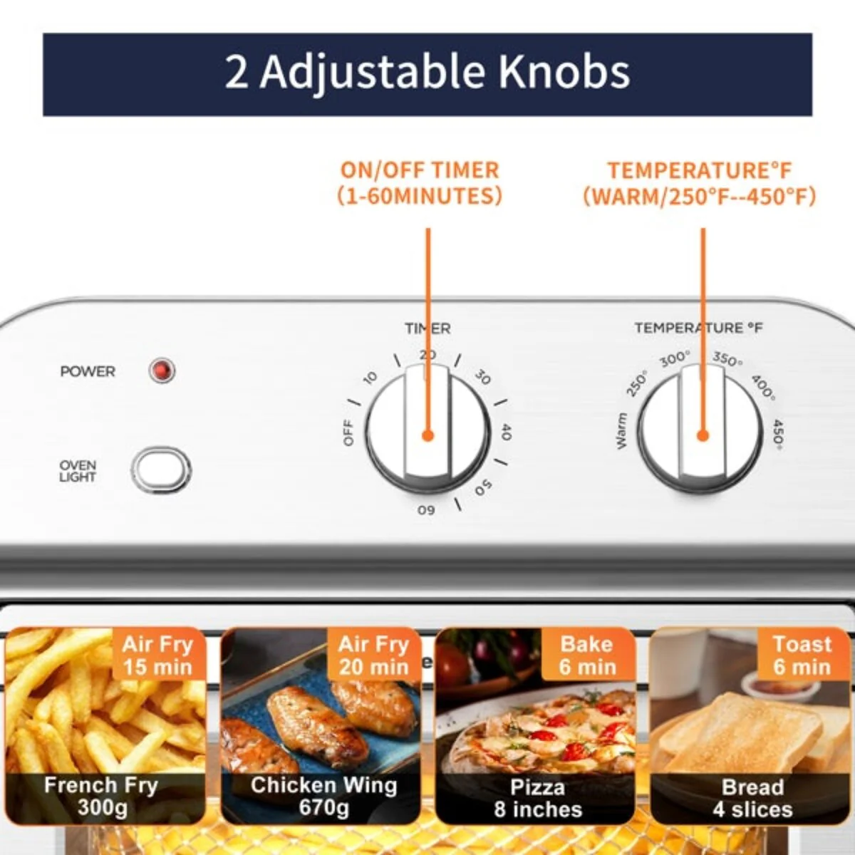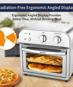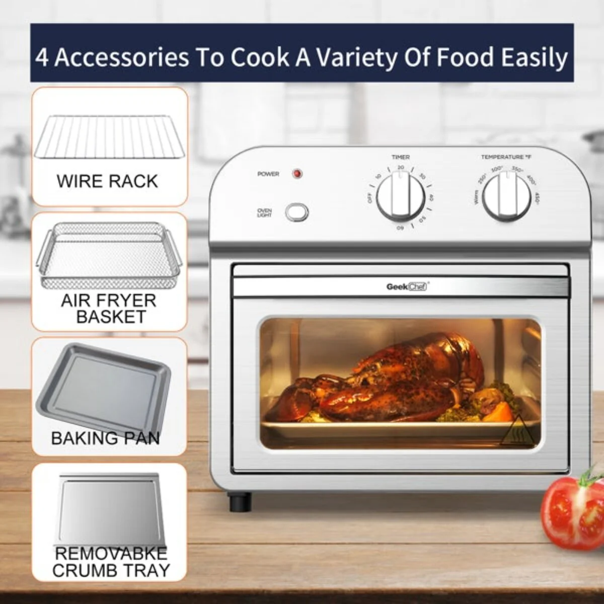 This unique kitchen appliance is actually a premium full size toaster oven with a built-in airfryer function. That means it not only bake, broil, and toasts, it also air fry. Air frying, which uses powerful ultra-hot air, is a innovative way to prepare delicious fried favorites by cutting over 85% fats. When the machine turn on, the air fry funtion will be turned on automatically. Enjoy the crunch without the calories and messy cleanup, with Geek Chef AirFryer Toaster Oven!