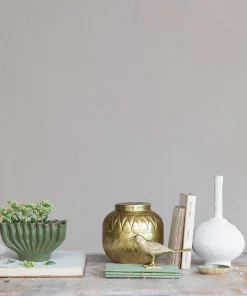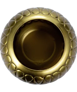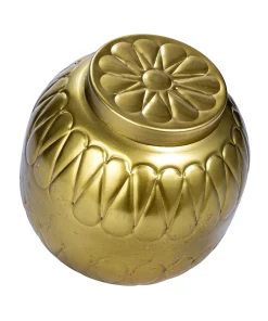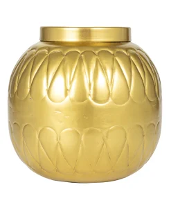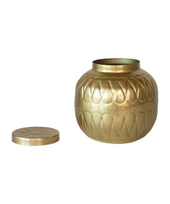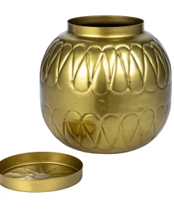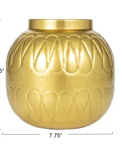 This decorative embossed metal container, gold finish is a stunning and practical piece for any home. It consists of a round base and a lid that feature a metal construction and an embossed design. The metal construction is sturdy and durable, which makes this container last for a long time. The embossed design creates a textured and elegant effect that makes this container stand out. The gold finish adds a touch of warmth and sophistication to this container. It is perfect for storing and displaying flowers, plants, candles, or other decorative items in the living room, bedroom, or entryway. It can also be used as a centerpiece or a vase for fresh or dried flowers. This container is easy to clean and maintain, and it will enhance any space with its beauty and style. It measures 7.75 inches in diameter and 7.75 inches in height, making it suitable for any space.