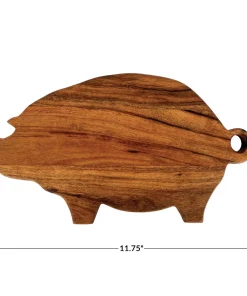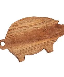 - A cute and quirky cheese/cutting board made of natural mango wood, featuring a pig shape, a handle, and a hanging hole on the tail