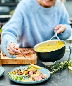 Stand up to the heat with DEMEYERE BLACK 5, our new innovative 5-ply cookware that’s thoughtfully crafted for both outdoor and indoor cooking. The unique, 5-layer body is designed with 18/10 stainless steel interior and exterior layers, a 3-layer aluminum core sandwiched in between for superior heat retention and distribution, followed by a heat-resistant ceramic coating added to the exterior for durability. DEMEYERE Black 5 blurs the boundaries of your kitchen so you can cook—and entertain—wherever inspiration strikes.