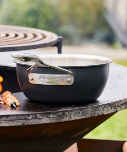 Go outside to enjoy an exceptional sear and smoky flavors, with stainless steel over an open flame, then wipe away the mess easily for fuss-free cleanup. The unique exterior coating can withstand the ultra-high temperatures of an open grill flame (heat resistant up to 752°F!) without corroding or staining, and quickly cleans up to bring indoors for prepping on the stovetop or in the oven. Designed to hide carbon and residue, DEMEYERE Black 5 will develop a sleek patina over time.
