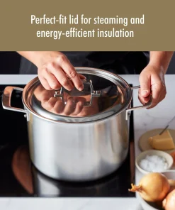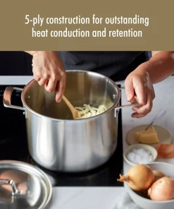 The durable 5-ply construction boasts optimal heat distribution, conduction, and retention. This guarantees even cooking from rim to rim, for succulent stews, delicious chili, and rich chicken stock. Don’t worry about cooking at high temperatures – the signature flat base stability prevents warping.