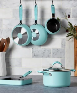 The Cookware is designed to promote efficient cooking and compliment entertaining lifestyles. This cookware set with an induction base delivers fast and even heating. The exterior is easy-to-clean and can be used as fun statement pieces in the kitchen. It may be mini in size but huge in personality! Each piece of cookware has a high-quality ergonomic silicone handle. Each handle is designed to reduce heat retention and deliver a modern style to enhance any kitchen.