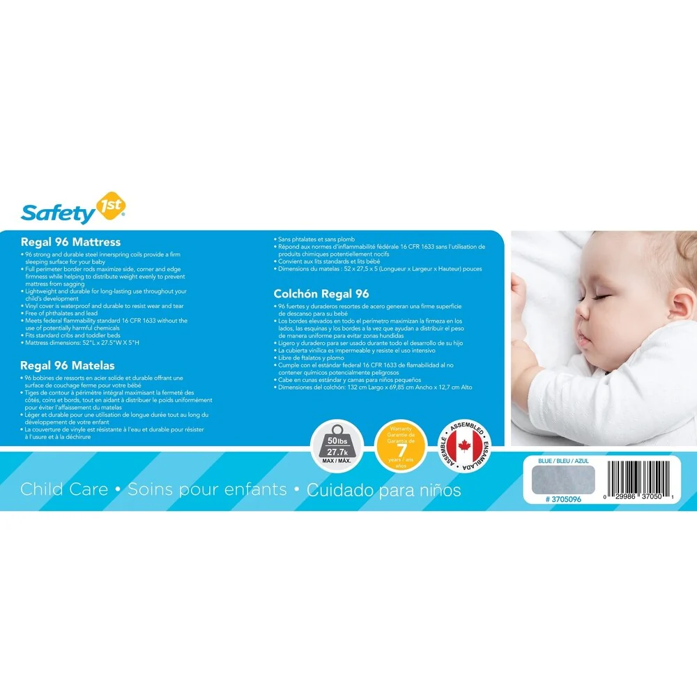 Women across America voted and Safety 1st earned the title of America’s Most Recommended™ brand for Crib & Toddler Mattress. Tuck your little prince or princess into our exquisite Safety 1st Regal 96 crib and toddler bed mattress, made with 96 inner-spring coils for a firm sleeping surface that’s also soft and comfortable. The vinyl waterproof star print cover comes in pink or blue to match baby’s room, and can be wiped clean to pick up messes quick and easy. The Safety 1st Regal 96 crib and toddler bed mattress is lightweight and built to last for years, with thick border rods that provide extra edge support for added safety.