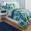 Multiple borders give the quilt a finished look, while the designs alternates between square patterns and solid blue sections that look adorable in a little boy’s room. The quilt reverses to the same square pattern that graces the front of this piece, for a cohesive look. With an oversized dinosaur on the front, contained within blue flanged borders, the pillow sham welcomes your child every day with the vision of one of his favorite things.