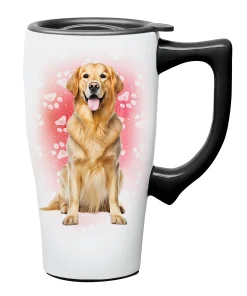 A great gift for anyone who loves their dog, this white ceramic travel mug fits in most vehicle cup holders and holds up to 18-oz. of your favorite hot or cold beverage. It has a locking lid, skid-resistant bottom and features your favorite breed atop a background of paw prints. Microwave and dishwasher safe. Ceramic mug is approx. 6 1/2"H. Choose: Black Lab, Golden Retriever, Dachshund, Yellow Lab, French Bulldog, German Shepherd, Doodle, Pug or Bulldog.