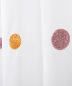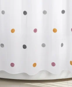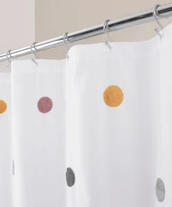 Add a soft and playful touch to your bathroom with the Dots Shower Curtain by Allure Home Creation. This fresh style features multi-colored pom pom tufts tossed on a white ground. This graceful style will bring chic charm and soft texture to your bathroom. This embellished shower curtain measures 70" x 72" and fits most standard sized tubs and shower areas providing privacy and protection from water splashing onto the floor. Crafted from 100% easy care polyester fabric with a reinforced buttonhole top that works well with standard shower hooks and curtain rods. Use of a liner is recommended. Machine wash and tumble dry on low heat.