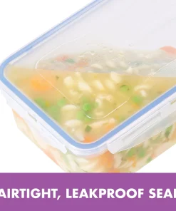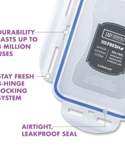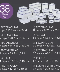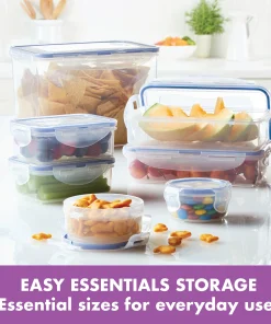 Get pantry perfect and organize your dried goods, food items, cereals, baking ingredients, snacks, leftovers and more with the Easy Essentials 38-Piece Food Storage Container Set.This massive set of large, medium, and small food containers with lids provides endless storage container options and a lightweight design makes it easy to move containers on higher pantry shelves and cabinets. LocknLock’s unique 4-hinge locking system has been durability tested to last up to 3 million uses, and the enhanced silicone seals are 100% airtight to keep foods fresh longer and 100% leakproof to prevent messy drips and sloppy spills. BPA-free construction provides a healthy and versatile storage solution for the pantry, cupboard, refrigerator, freezer or anywhere your foods need to stay fresh. Plus, Easy Essentials containers are microwave safe for convenient reheating and dishwasher safe for easy cleanup. For a comprehensive set of 100% leakproof food storage containers that keep foods fresh and ready to go, reach for the Easy Essentials 38-piece Food Storage Container Set.