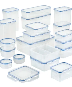 Get pantry perfect and organize your dried goods, food items, cereals, baking ingredients, snacks, leftovers and more with the Easy Essentials 38-Piece Food Storage Container Set.This massive set of large, medium, and small food containers with lids provides endless storage container options and a lightweight design makes it easy to move containers on higher pantry shelves and cabinets. LocknLock’s unique 4-hinge locking system has been durability tested to last up to 3 million uses, and the enhanced silicone seals are 100% airtight to keep foods fresh longer and 100% leakproof to prevent messy drips and sloppy spills. BPA-free construction provides a healthy and versatile storage solution for the pantry, cupboard, refrigerator, freezer or anywhere your foods need to stay fresh. Plus, Easy Essentials containers are microwave safe for convenient reheating and dishwasher safe for easy cleanup. For a comprehensive set of 100% leakproof food storage containers that keep foods fresh and ready to go, reach for the Easy Essentials 38-piece Food Storage Container Set.