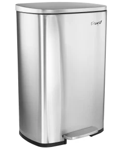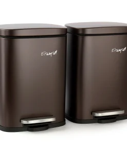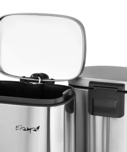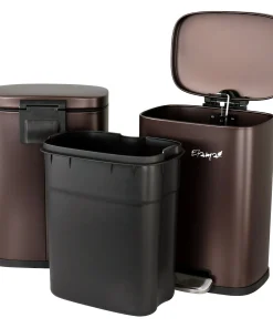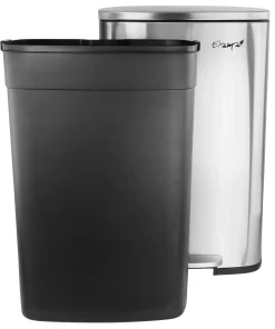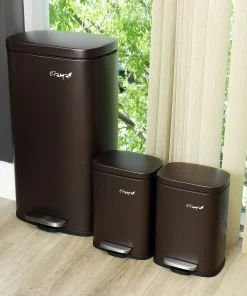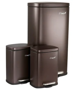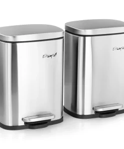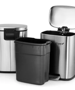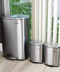 Elama’s 3 piece 13Gal and 1.3Gal Matte Silver Trash Bin Set is the ideal choice for any Home or Kitchen with its stainless steel, easy to clean finish and no touch pedal open function. This set comes with three individual trash cans to cover all areas of your home; including one large 50 Liter/13 Gallon bin for your kitchen, and two small 5 Liter/1.3 Gallon trash bins that are perfect for your bathroom or home office. Each bin included features a strong steel pedal engineered for a smooth and easy step that gives it stable operation, and a removable inner plastic bucket for easy trash disposal. Slow close lid is smooth and prevents loud slamming or fingers getting caught, while the handle on the back allows you to move can freely without needing to touch the bin. Rectangular shape fits perfectly against walls allowing you to go about your day easily. Keep your home simple, sleek, efficient, and clean with this set of three!