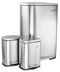 Elama’s 3 piece 13Gal and 1.3Gal Matte Silver Trash Bin Set is the ideal choice for any Home or Kitchen with its stainless steel, easy to clean finish and no touch pedal open function. This set comes with three individual trash cans to cover all areas of your home; including one large 50 Liter/13 Gallon bin for your kitchen, and two small 5 Liter/1.3 Gallon trash bins that are perfect for your bathroom or home office. Each bin included features a strong steel pedal engineered for a smooth and easy step that gives it stable operation, and a removable inner plastic bucket for easy trash disposal. Slow close lid is smooth and prevents loud slamming or fingers getting caught, while the handle on the back allows you to move can freely without needing to touch the bin. Rectangular shape fits perfectly against walls allowing you to go about your day easily. Keep your home simple, sleek, efficient, and clean with this set of three!