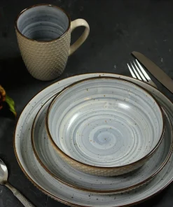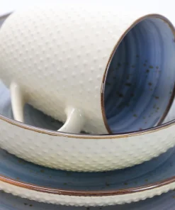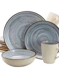 Add a touch of elegance to your dining table with the Elama Embossed Dot Two Tone 16-Piece Dinnerware Set in Powder Blue. The set features a gentle powder blue color, speckled with brown and finished with a brown rim, creating a delicately balanced swirling pattern. The cream glossy exterior is adorned with charming de-bossed dots, adding a touch of harmony to this stunning set. The dishes are textured on the outside for added sensory pleasure and smooth on the inside for easy cleaning after your favorite meals. With its unique size and shape of raised rims, this set is perfect for mess-free dining experiences. It also makes a perfect gift for your loved ones. Cleaning up is a breeze as all the plates, bowls, and mugs are dishwasher safe. Additionally, you can use these dishes for leftovers and storage, as they are both microwave and refrigerator safe.