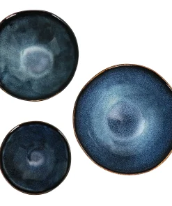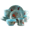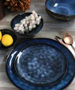 Upgrade your dinnerware collection with the Elama Lucca 20 Piece Round Stoneware Triple Bowl Dinnerware Set in Blue. This set includes dinner plates, dessert plates, and bowls of various sizes, each with a unique design and colored rim. The reactive glaze finish gives each piece a touch of elegance. Perfect for entertaining guests or enjoying a meal with family, this set adds color and style to any table.