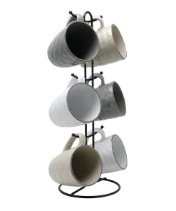 The delicate and elegant Tahitian Waves mugs will add some style to your mornings and transport you to the tranquility of the stunning Tahitian beaches. Made of durable stoneware, these beautiful cups feature an intricate diamond-like texture for added flair. This set comes with a sturdy metal stand to easily display and store these graceful cups.This set includes :Six 12 oz mugs, each measuring in at 4.75" x 3.5" x 4" (0.65 lbs.)One metal stand, measuring in at 16.25" x 5.75" x 5.75" (0.5 lbs.)