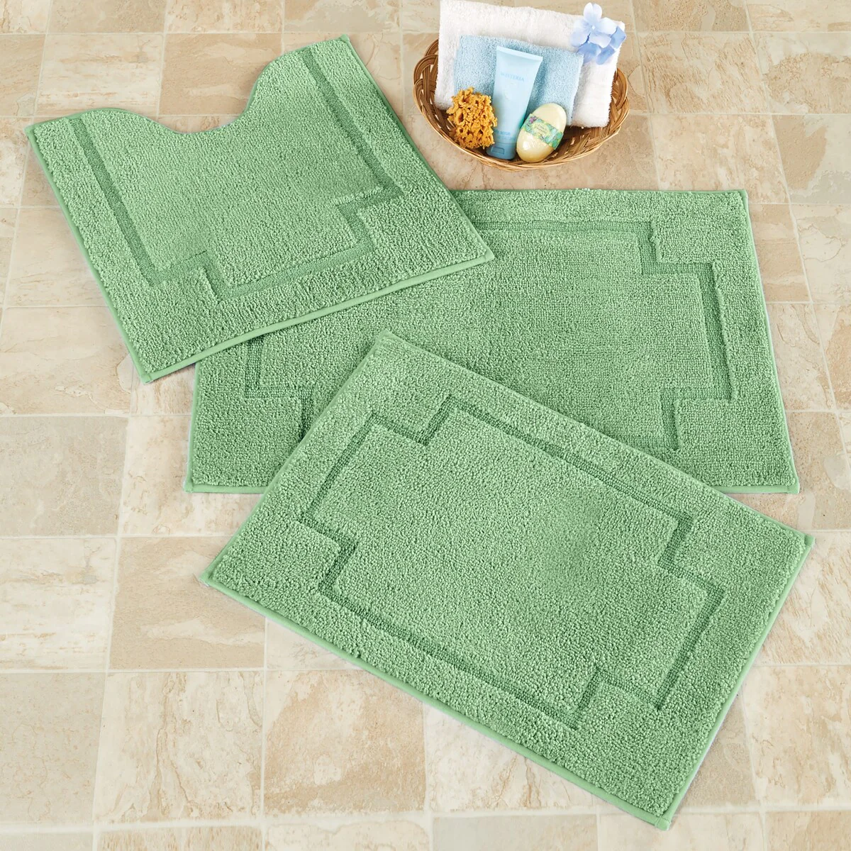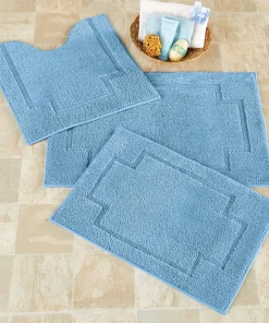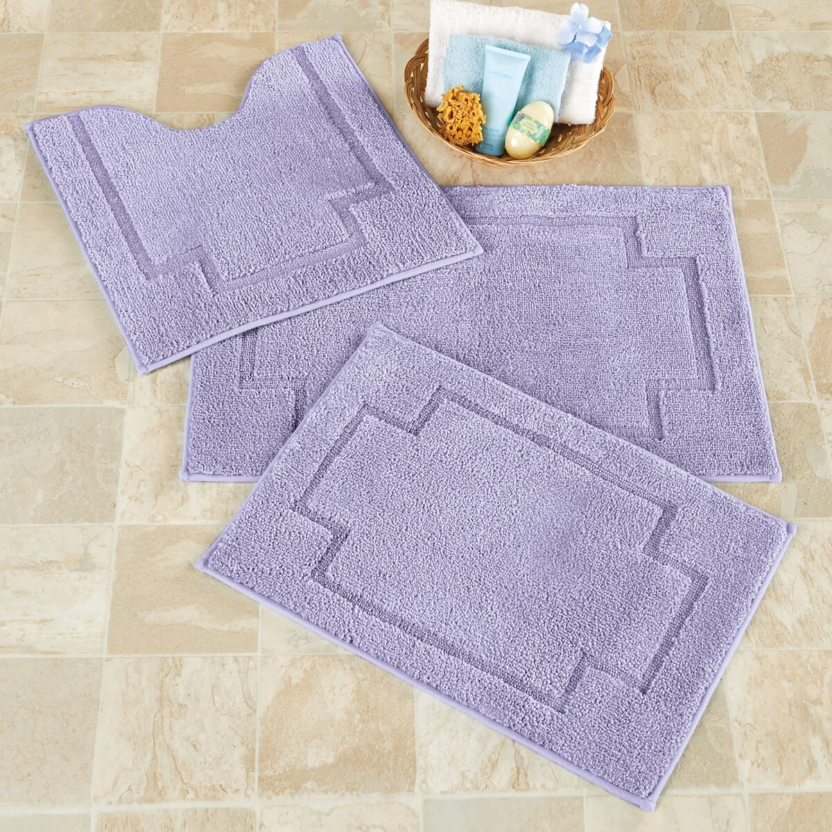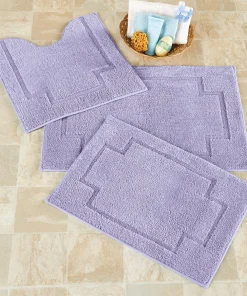 Available in four lovely colors, this elegant rug set is the perfect finishing touch for your bath. This 3-piece bath rug set includes a contour mat that fits around the base of your toilet, a large rug to cushion your step from the bath, and another rug for in front of the sink. Each tufted rug has a skid-resistant backing. Machine wash. Polyester and latex; imported. Bath mat: 20"L x 30"W, Sink mat: 17"L x 24"W, Contour mat: 20"L x 20"W. Choose: Light Blue, Rose, Sage or Lilac. 3-Piece Set.