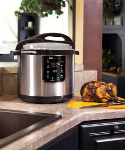 Enjoy nutritious, fast and flavorful cooking with the Elite Platinum 10 Qt. Digital Pressure Cooker. The unique process of pressure cooking allows you to trap steam during the cooking process, thereby, cooking food evenly, sealing in nutrients, and, most important of all, retaining flavor. With a 24-hour delay timer, and a 10 quart inner pot you can cook a wide variety of meals for the whole family. Use the preset functions to cook delicious risotto, vegetables, meat, chicken, and much more with this versatile and elegant pressure cooker. Note: There will be steam coming out from top. The steam escapes from the unit to avoid the item building pressure and exploding. The vent provided is meant to allow steam to escape.