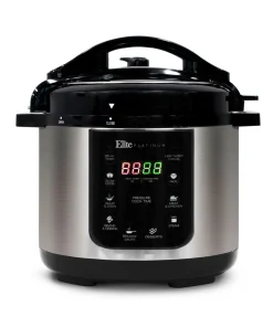 Enjoy nutritious, fast and flavorful cooking with the Elite Platinum 4 Qt. Digital Pressure Cooker. The unique process of pressure cooking allows you to trap steam during the cooking process, thereby, cooking food evenly, sealing in nutrients, and, most important of all, retaining flavor. With 9 preset functions including browning and keep warm, manual operation, a 24-hour delay timer, and a 4 Qt. inner pot you can cook a wide variety of meals for the whole family. Use the preset functions to cook delicious risotto, vegetables, meat, chicken, and much more with this versatile and elegant pressure cooker.9 MultifunctionsConvenient browning function pre-browns meats in the same pot prior to pressure cooking24-hour delay timer allows user to program cooking to begin at a later timeAttractive brushed stainless steel housingRemovable nonstick 4-qt. interior cooking potProgrammable pressurized cook time from 0-99 minutes for customized cookingAutomatic resumption of cooking when power is restored after a power failureAutomatic keep warm feature at end of each cooking cycleIndicator beep at end of cooking cycle000