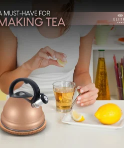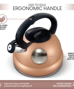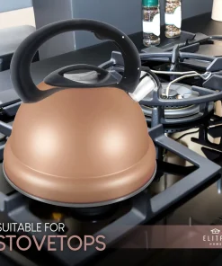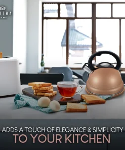 The new and improved ELITRA Whistling Tea Kettle fits all kitchen styles, distributes heat evenly and lets out a loud whistle when your water starts to boil. Made from high quality stainless steel with a coating around the outside to prevent scuffs. The inside of this kettle is mirrored to prevent rust spots. Pour up to 12 cups of water: this whistling tea kettle can heat up 3.1 Quarts (3L) of water for your tea. With an encapsulated bottom, this kettle is suitable for induction stovetops. Smartly designed with an ergonomic nylon handle that stays cool to the touch; the spout has a one-hand trigger mechanism that allows for a convenient-one handed operation. The modern design with a beautiful rose gold finish adds an elegant touch to your kitchen. The large lid is easy to clean; hand wash is recommended. For best care, hand wash before use in warm, soapy water and dry thoroughly. (Avoid using an abrasive cleaner or cleaning tool as this will scratch the surface.