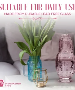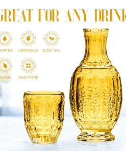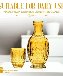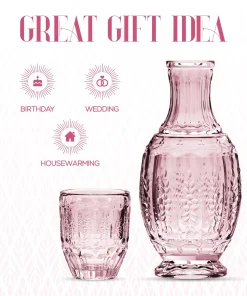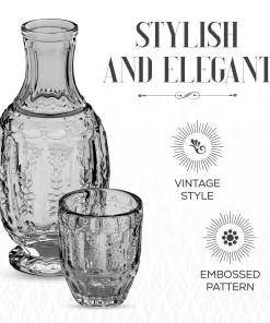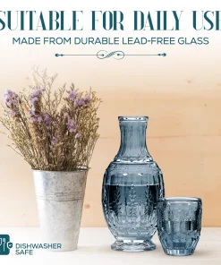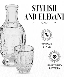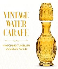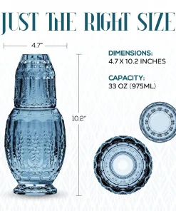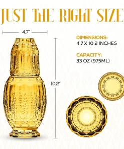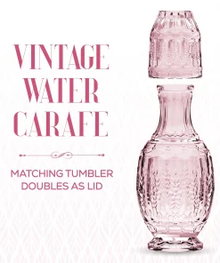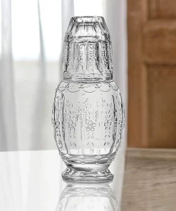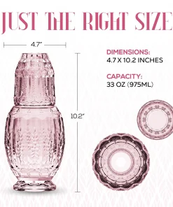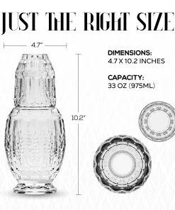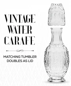 Elle Decor Vintage Bedside Water Carafe with Tumbler Glass – Elegant Pitcher and Matching Drinking Cup Doubles as Lid, Tuck into elegant hydration with a bedside carafe! Be the ultimate hostess or simply treat yourself to a touch of luxury by keeping water and other beverages conveniently and beautifully within reach. Placed on a nightstand, the stylish bedside water carafe set from Elle Decor welcomes your guests and shows how much you care. Made from durable lead-free glass, this carafe and matching tumbler is a healthier, greener alternative to plastic water bottles. With the glass doubling as a lid, it’s practically pretty! Elle Decor brings you unique gift ideas and collectibles crafted with the time-honored techniques of yesteryear. Decorate your trendy abode with our entire collection of home décor and other artful accessories and purchase confidently knowing your treasure always arrives in perfect condition. Finally, you can be the consummate host to all your friends and discerning design enthusiasts. Pamper your guests in style by adding this bedside water carafe set to your cart today! Includes: 1 water carafe from Elle Decor Dimensions: 4. 7 x 4. 7 x 10. 2 inches Material: lead-free glass Carafe Capacity: 33oz.
