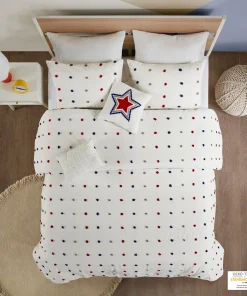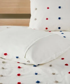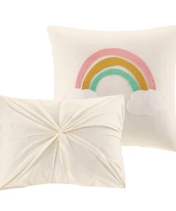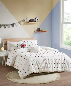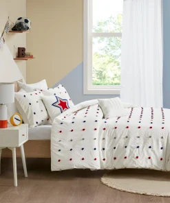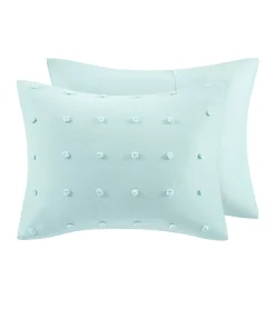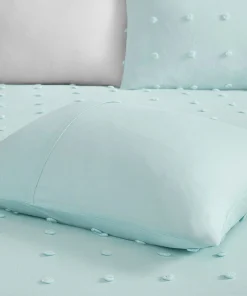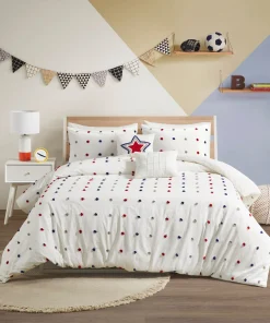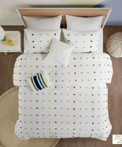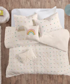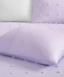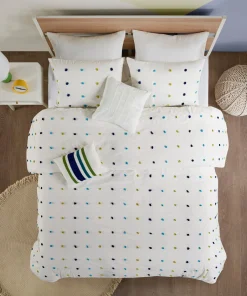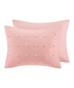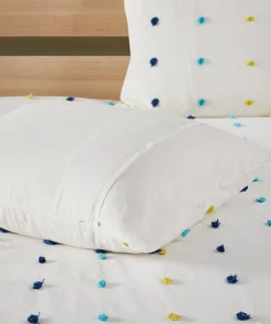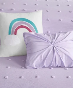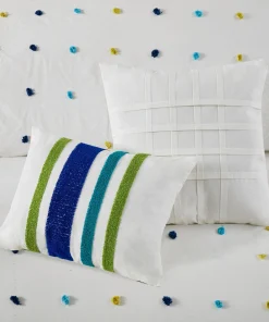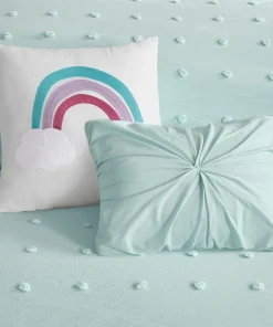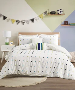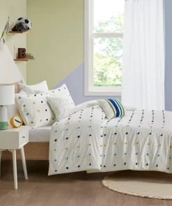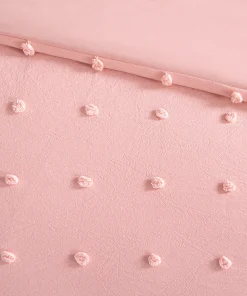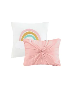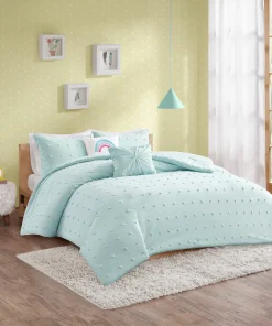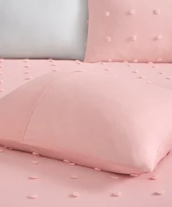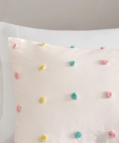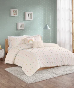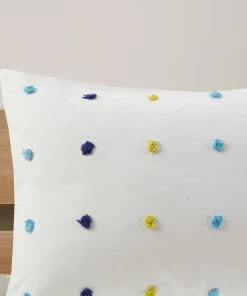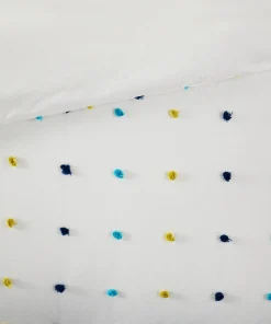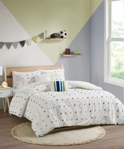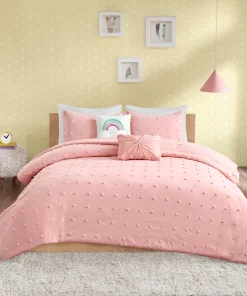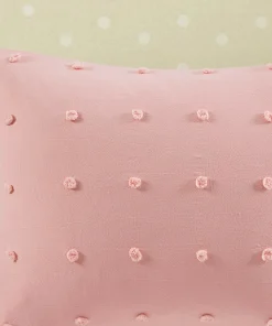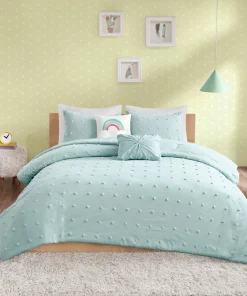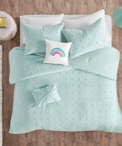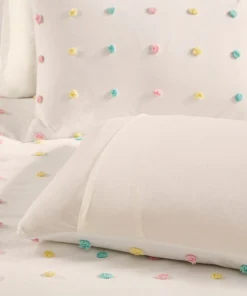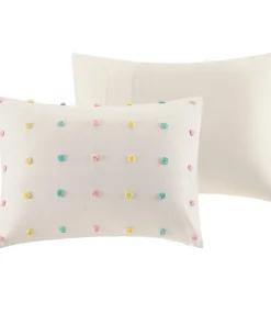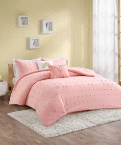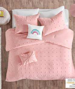 Create a cute and cozy look in your child’s bedroom with the Intelligent Design Kids Ensley Cotton Jacquard Pom Pom Comforter Set. This cotton comforter features an all-over jacquard pom pom design that adds texture, for a shabby chic look. Matching shams (1 for Twin Sizes) pair perfectly with the comforter, while a square and an oblong decorative pillow complete this adorable kid’s comforter set. Machine washable, this bedding set is also OEKO-TEX certified, meaning it does not contain any harmful substances or chemicals, and uses an antimicrobial treatment that provides built-in freshness protection, reducing the growth of odor causing bacteria to keep fabric lasting longer.
