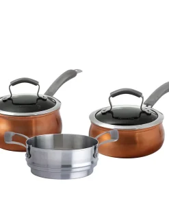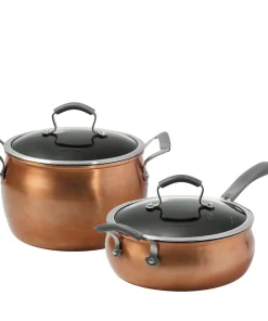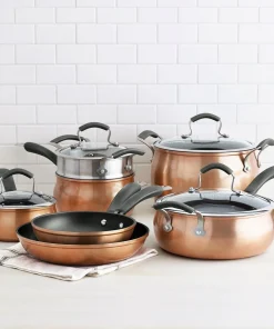Upgrade your kitchen with the Epicurious 11Pc Aluminum Cookware Set in Copper. Each pot and pan boasts a visually stunning design that’s as practical as it is beautiful. With heavy-gauge aluminum construction and an impact-bonded stainless steel base, this set offers rapid and even heat distribution, making cooking a breeze. The metal utensil safe nonstick interior ensures food won’t stick, while the copper exterior finish adds a touch of elegance to your cooktop.