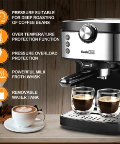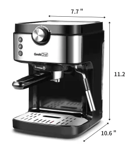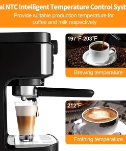 Coffee & Espresso Maker with Foaming Milk Frother Wand. 1300W No-Leaking 900 ml Removable Water Tank Coffee Maker For Espresso, Cappuccino, Latte, Macchiato. With a 20 bar pressure pump to ensure the coffee flavor and with a frothing rod for making creamy cappuccino and latte, it is a 2-in-1 espresso machine with a milk frother. And it can automatically dual temperature control. Rated Voltage: 120V~ 60Hz, Rated Power: 1300W, United Stated Standard.