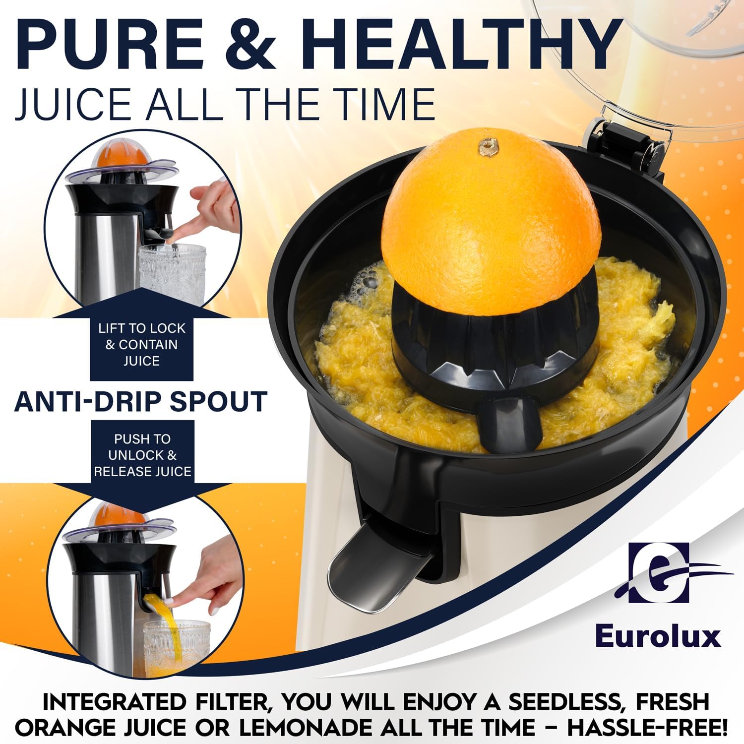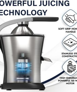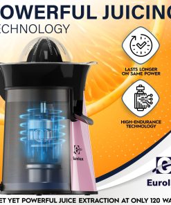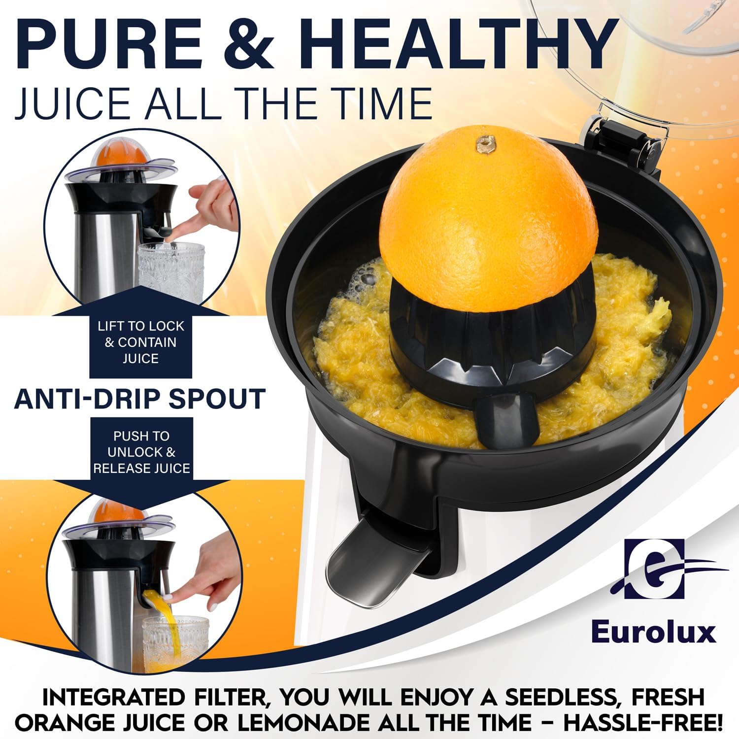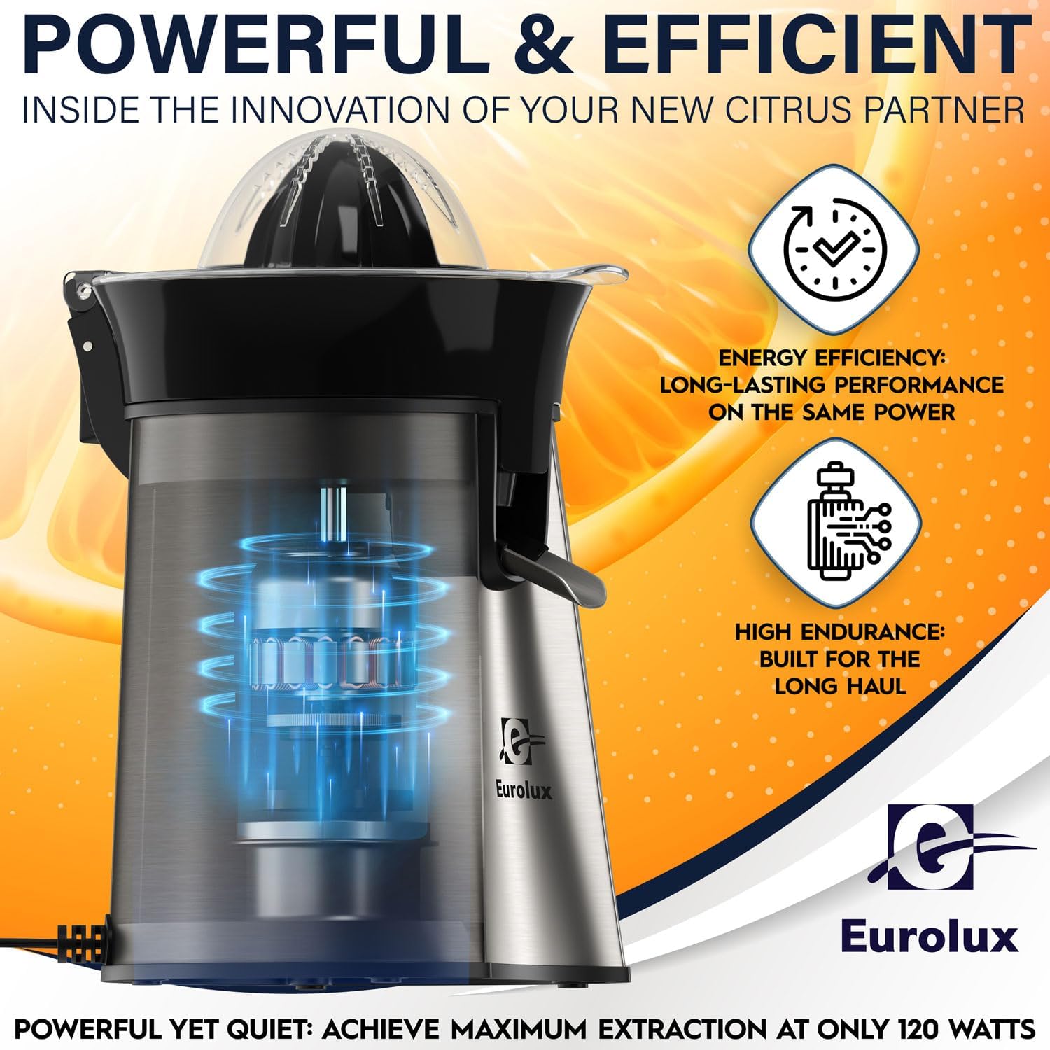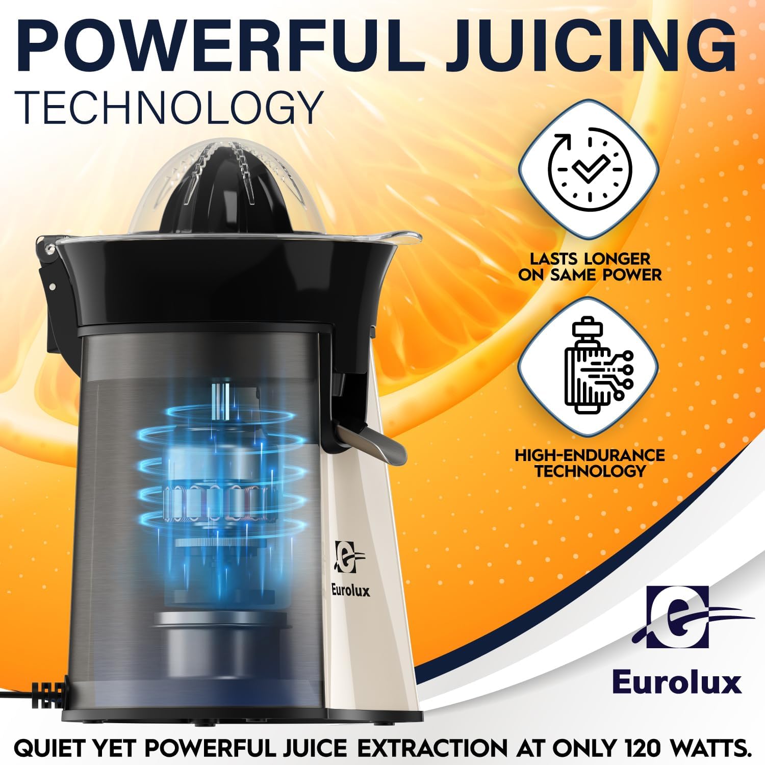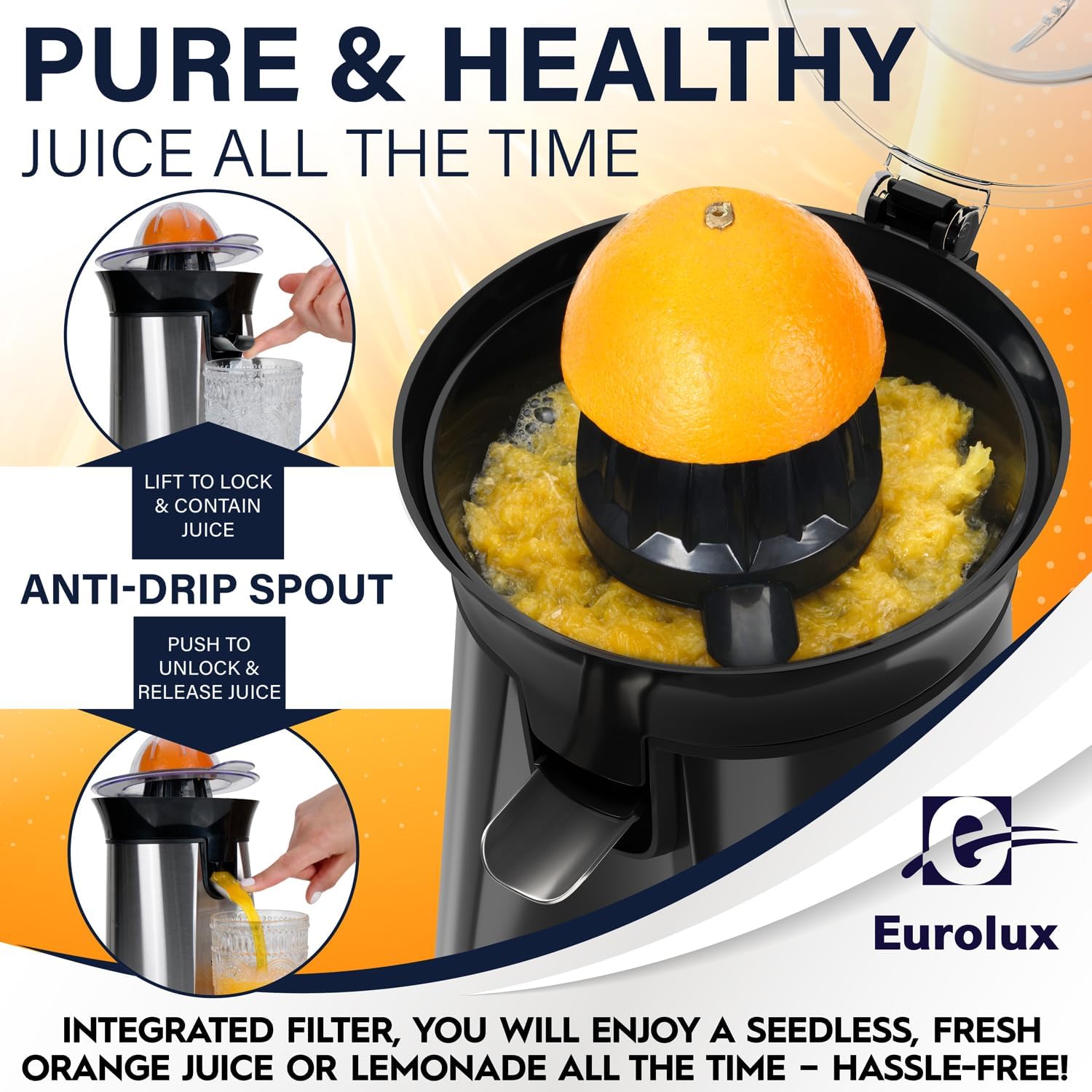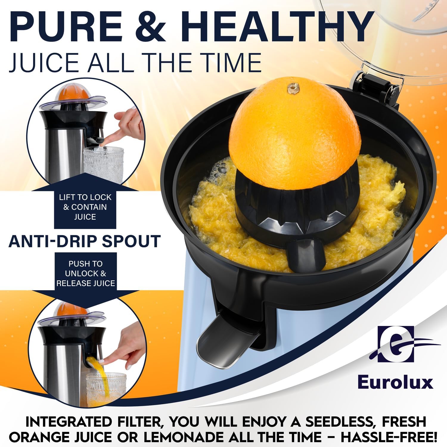 Eurolux Premium Electric Orange Juicer | Stainless Steel Citrus Squeezer With New Ultra-Powerful Motor and Soft Grip Handle for Effortless Juicing, Auto Shutoff, Dishwasher-safe Parts, Pulp Control