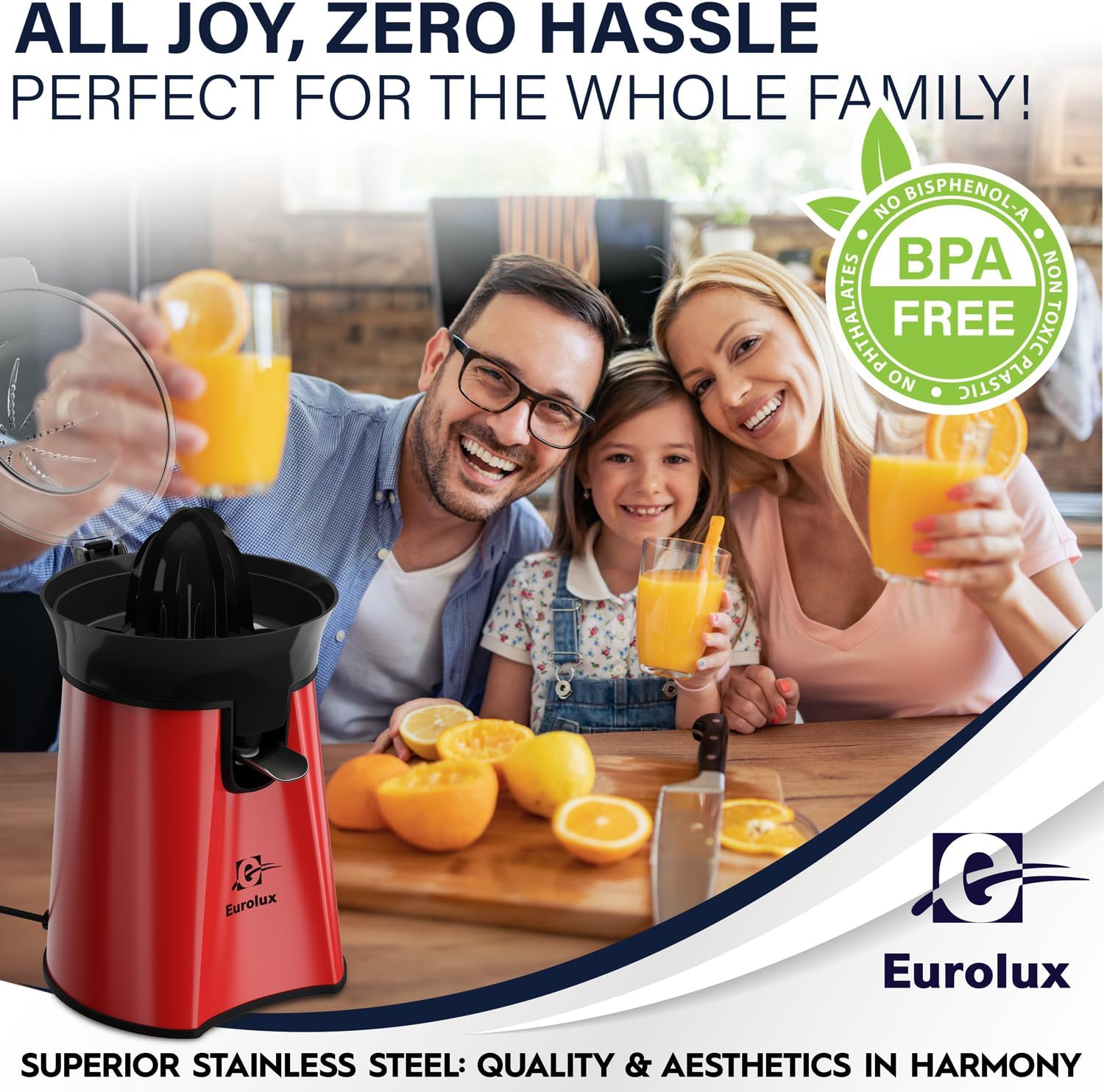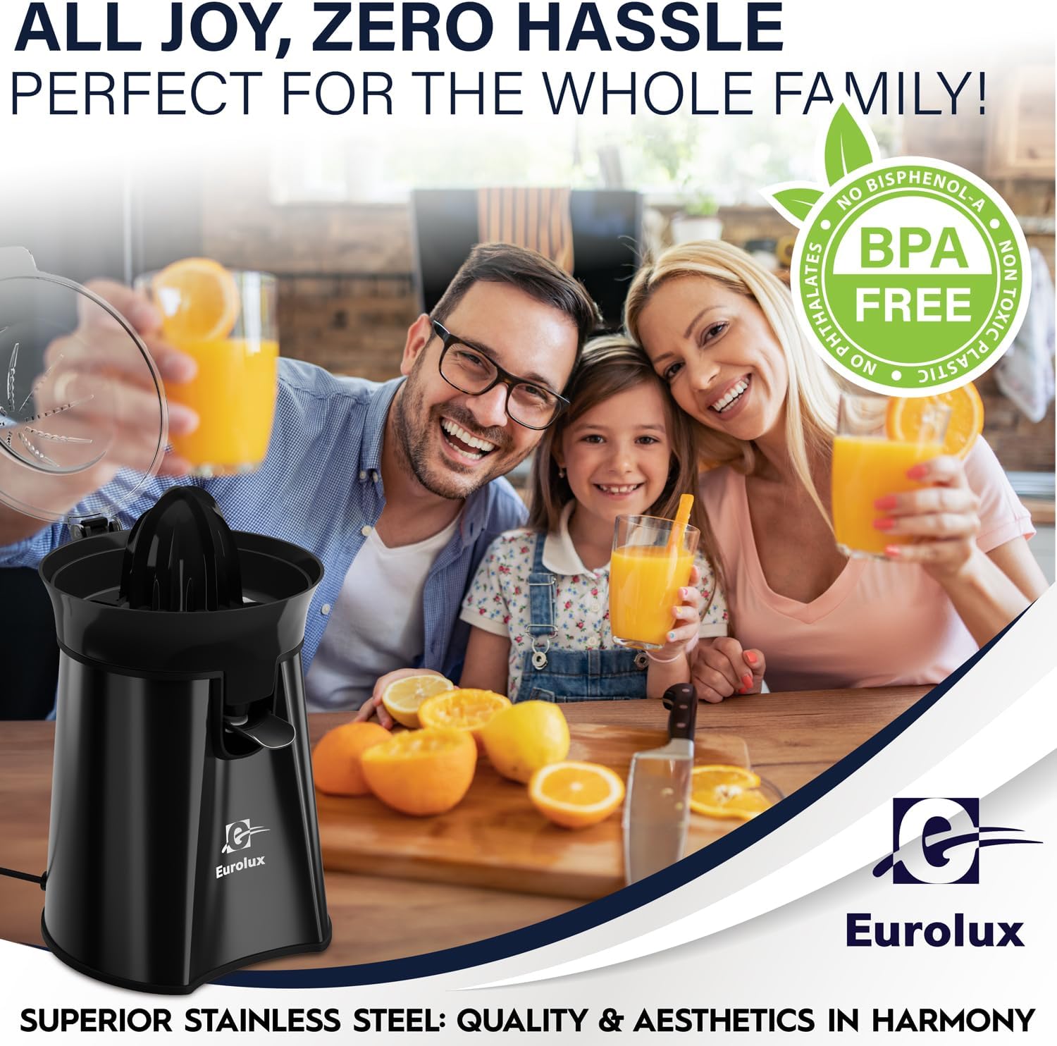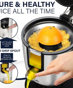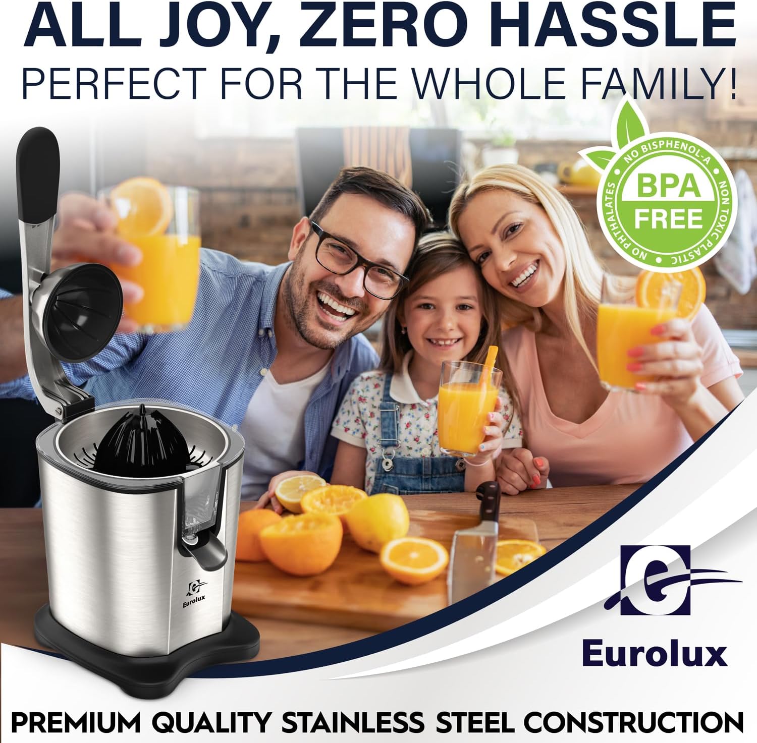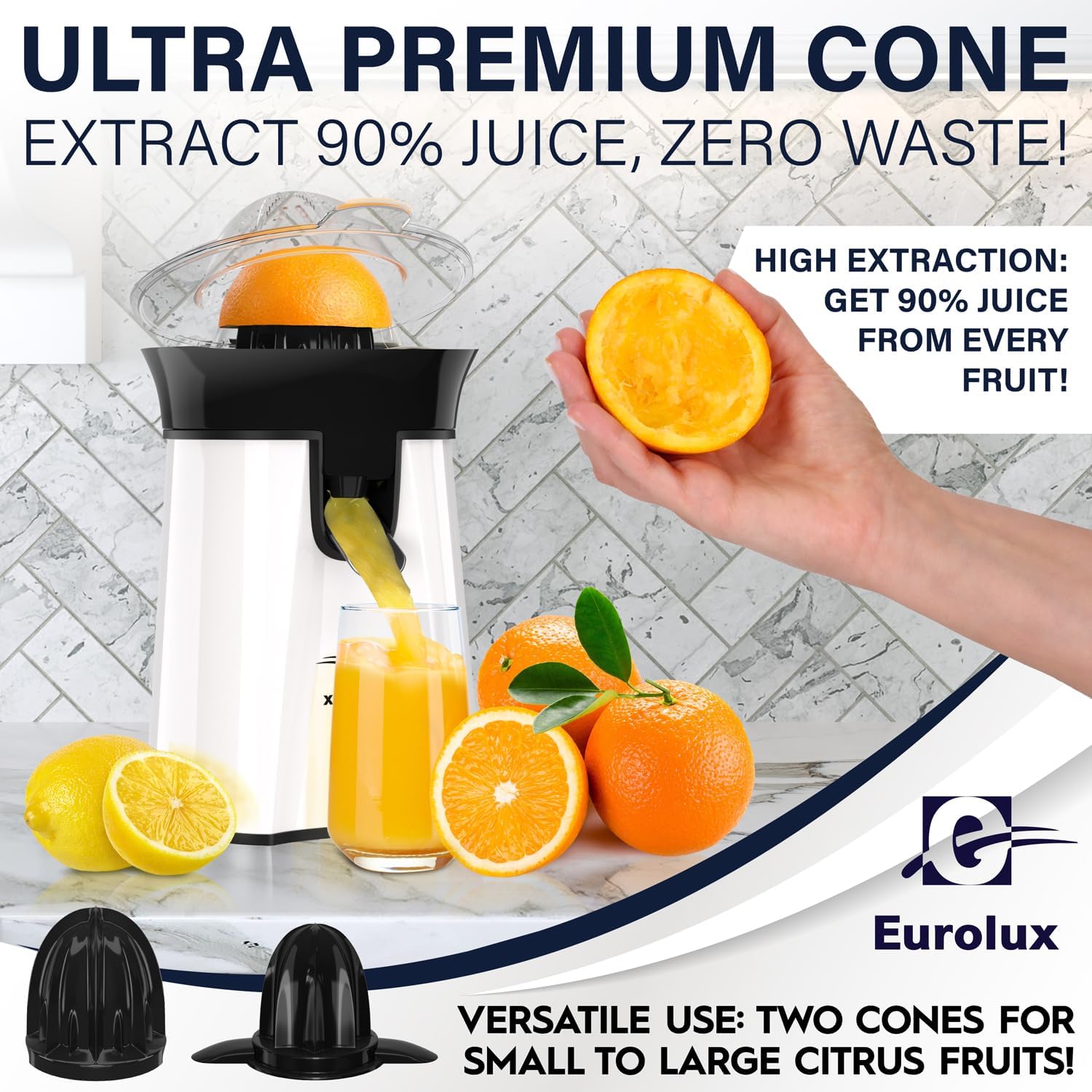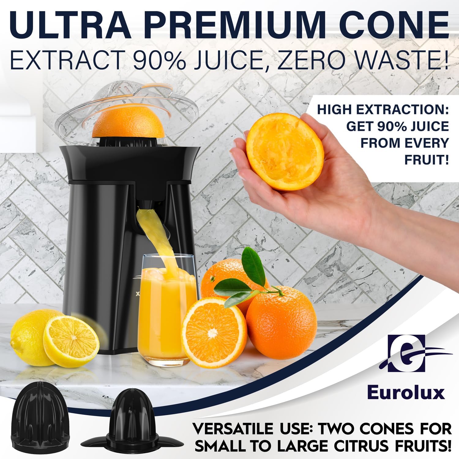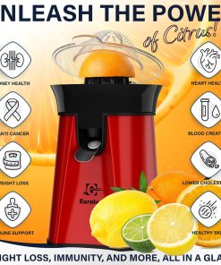 Eurolux Premium Electric Orange Juicer | Stainless Steel Citrus Squeezer With New Ultra-Powerful Motor and Soft Grip Handle for Effortless Juicing, Auto Shutoff, Dishwasher-safe Parts, Pulp Control