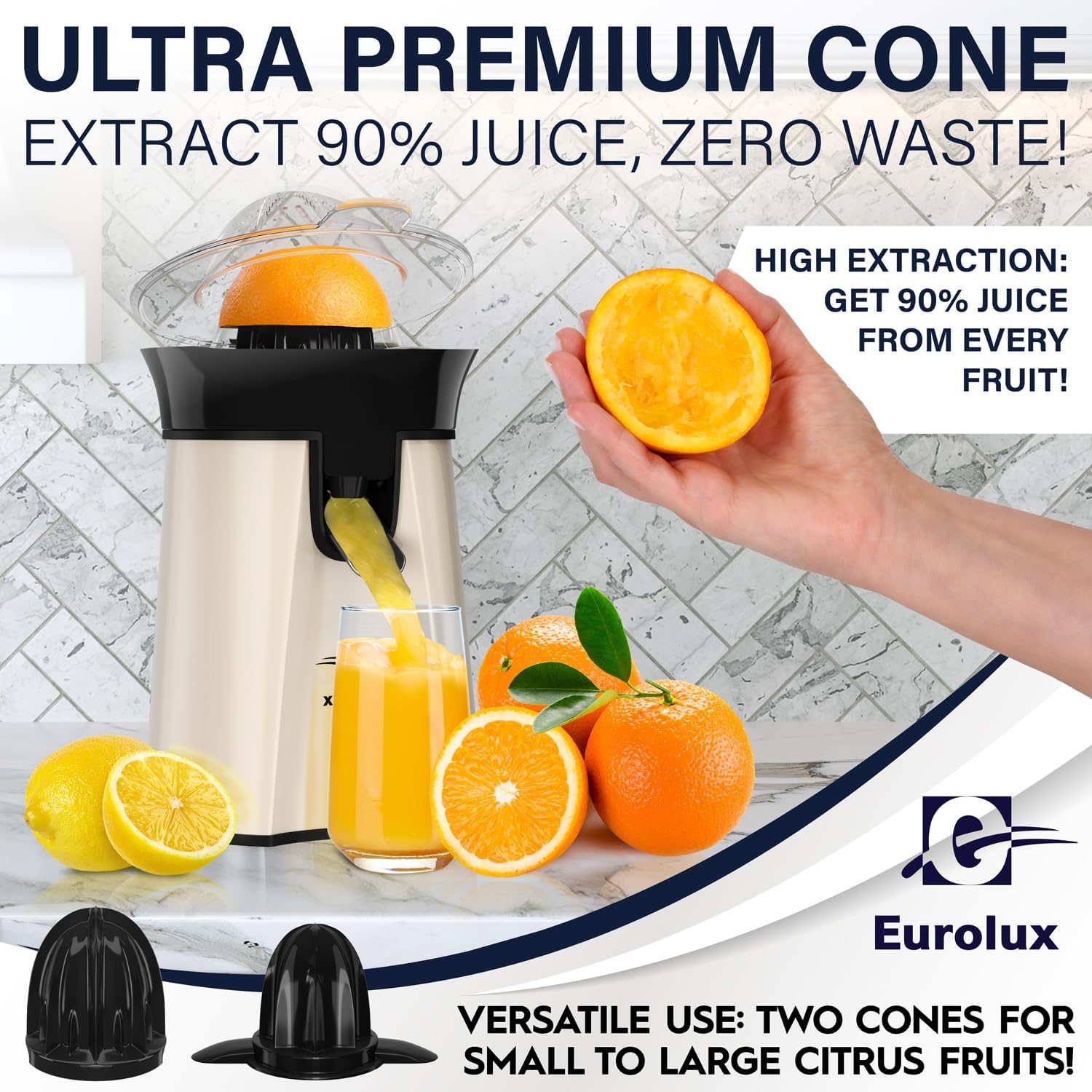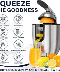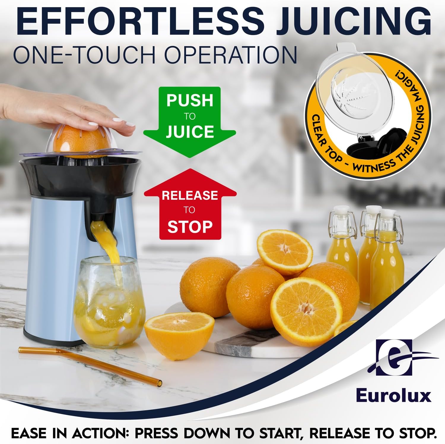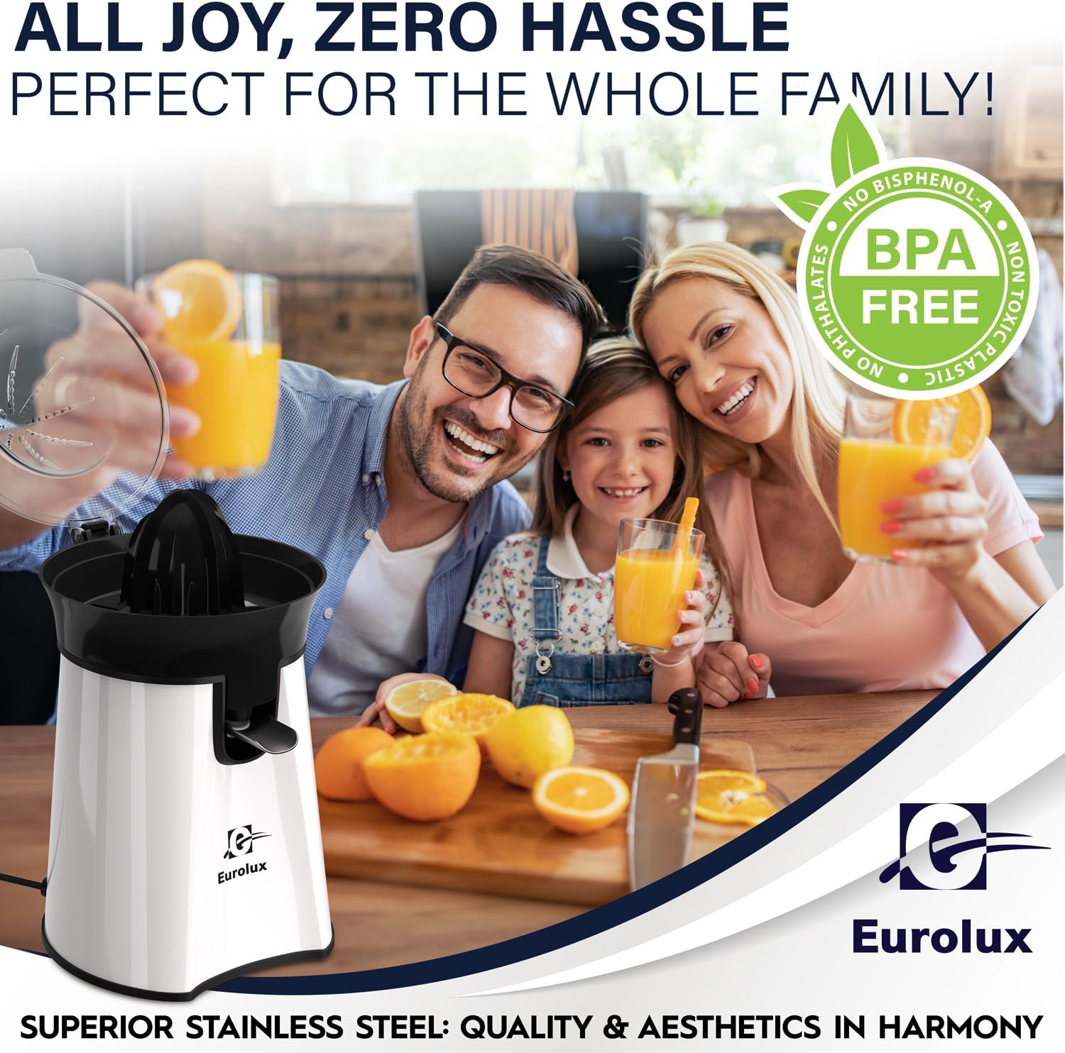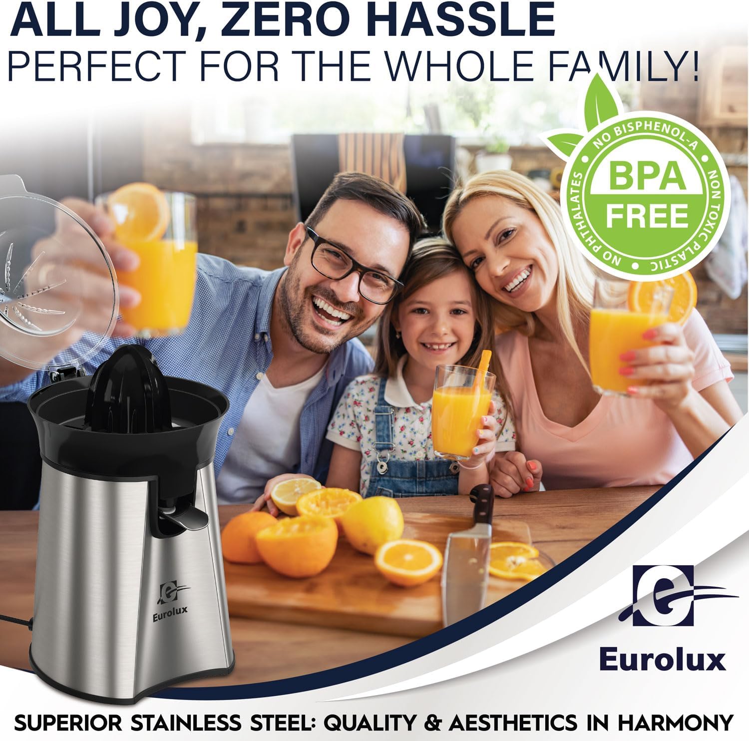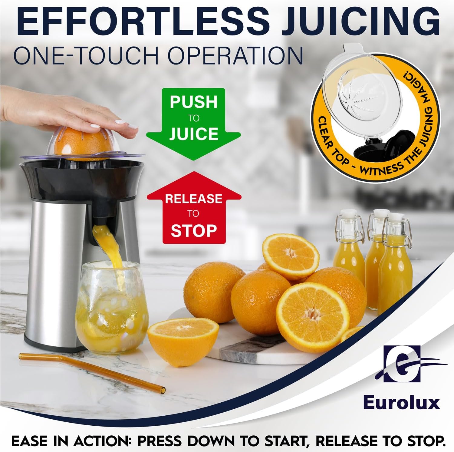 Eurolux Premium Electric Orange Juicer | Stainless Steel Citrus Squeezer With New Ultra-Powerful Motor and Soft Grip Handle for Effortless Juicing, Auto Shutoff, Dishwasher-safe Parts, Pulp Control
