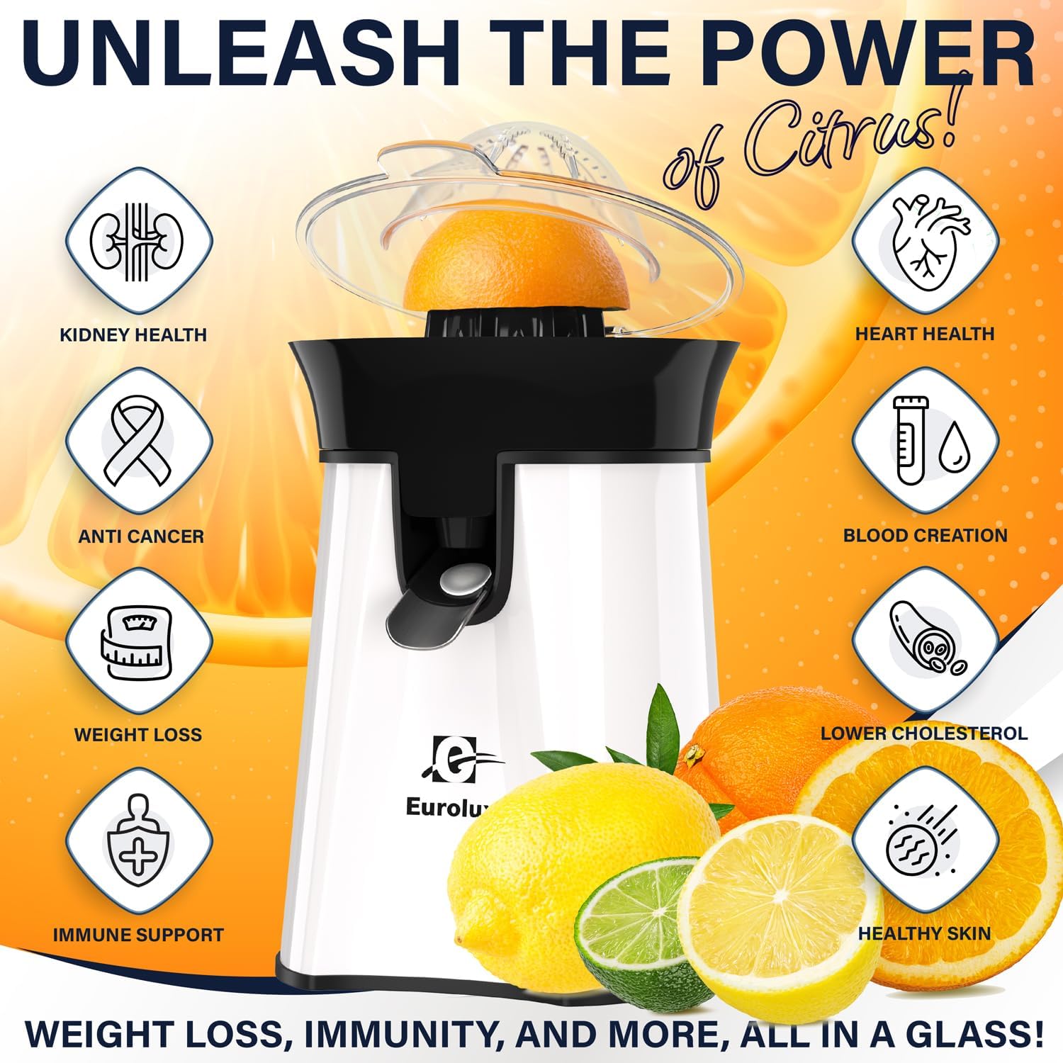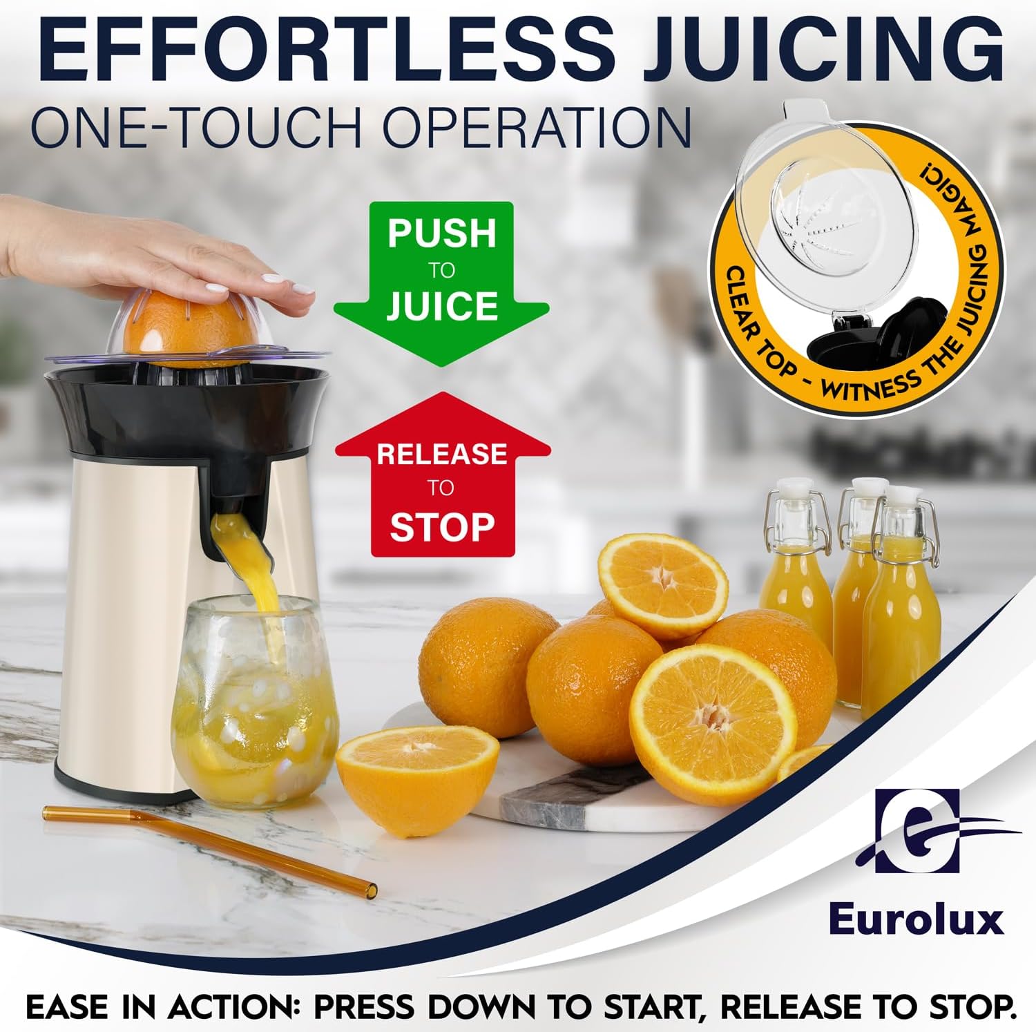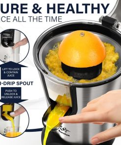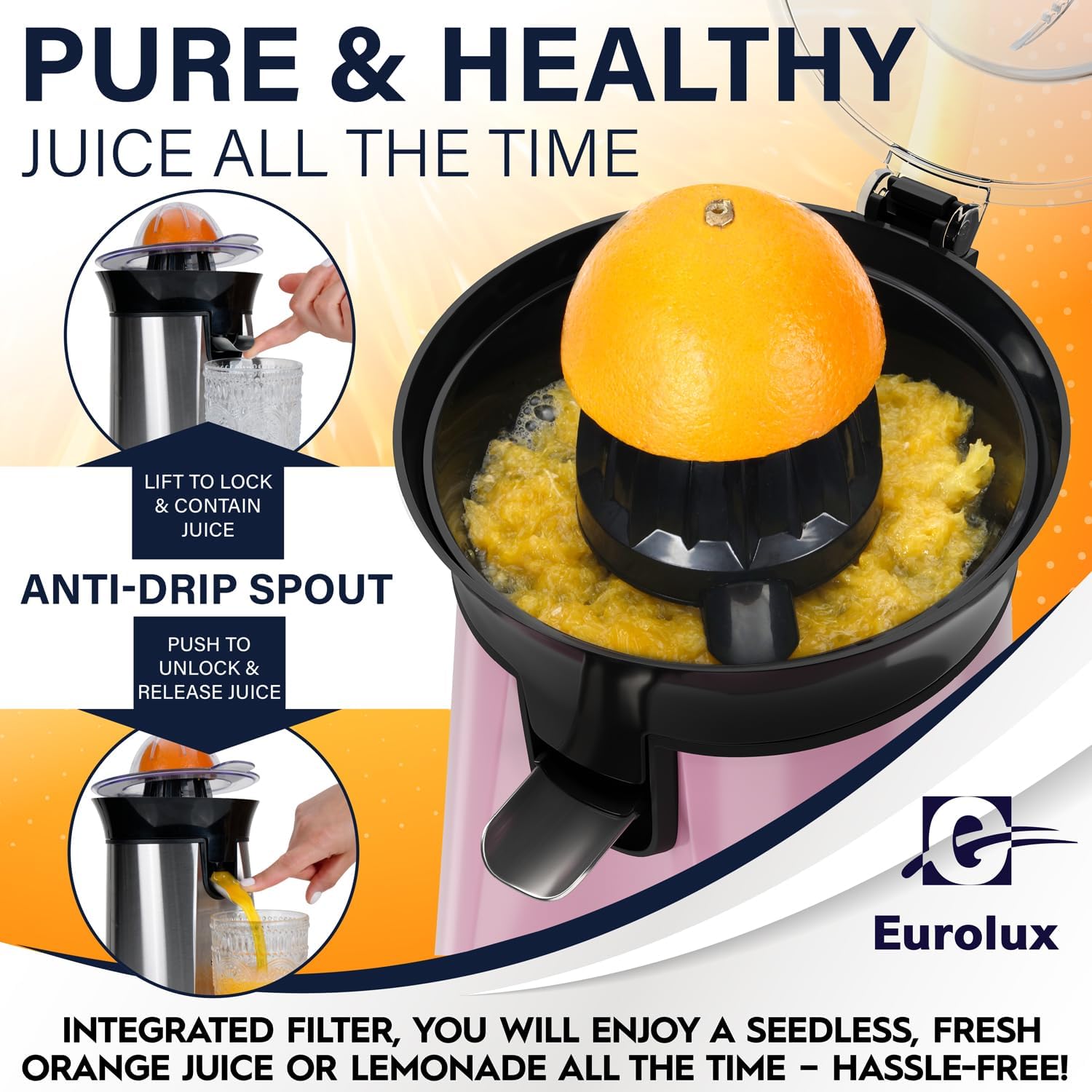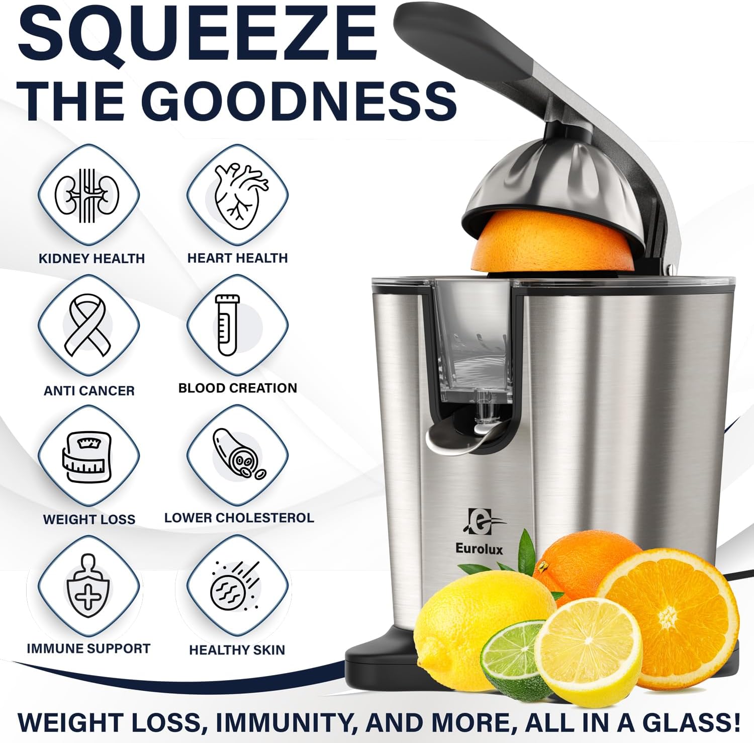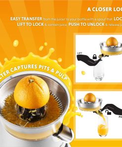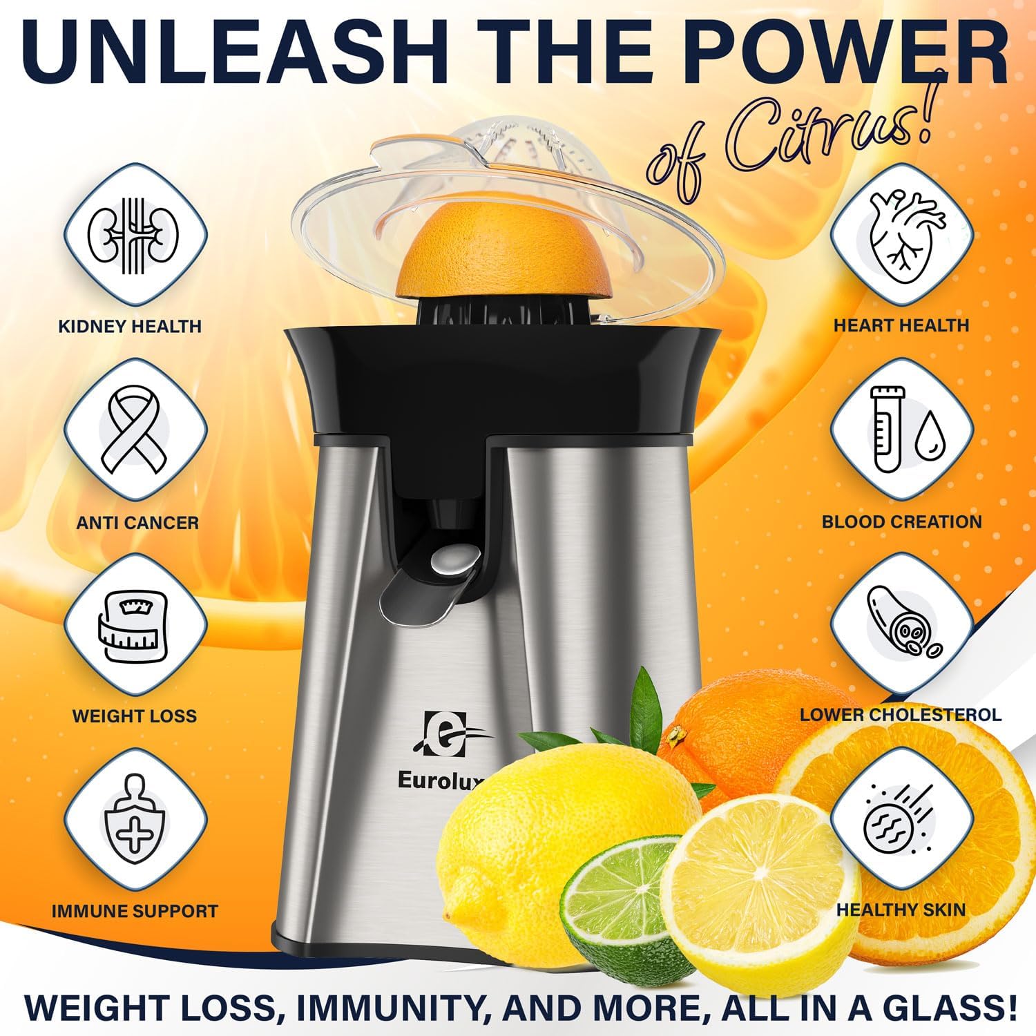 Eurolux Premium Electric Orange Juicer | Stainless Steel Citrus Squeezer With New Ultra-Powerful Motor and Soft Grip Handle for Effortless Juicing, Auto Shutoff, Dishwasher-safe Parts, Pulp Control